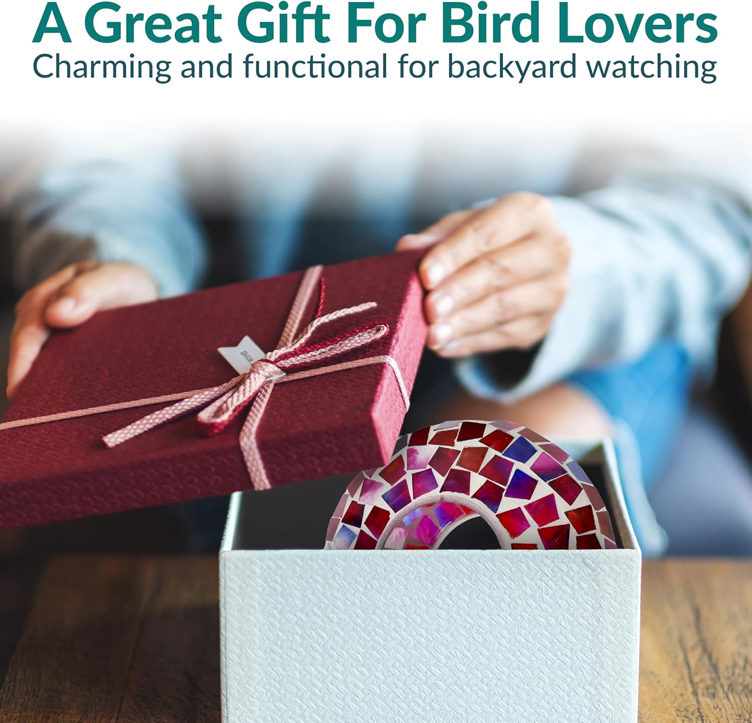 - ATTRACT BIRDS TO THE YARD: This cute bird feeder features vibrant colors and a mosaic glass construction that is sure to appeal to humans and birds alike. The bright colors and reflective material will help attract a variety of bird species to the feeder including cardinals, finches, sparrows, and more. Plus, it will add a stylish pop of color to any patio decor. The open fly-through design also makes it easier for birds to access the seed, encouraging them to come back again and again.