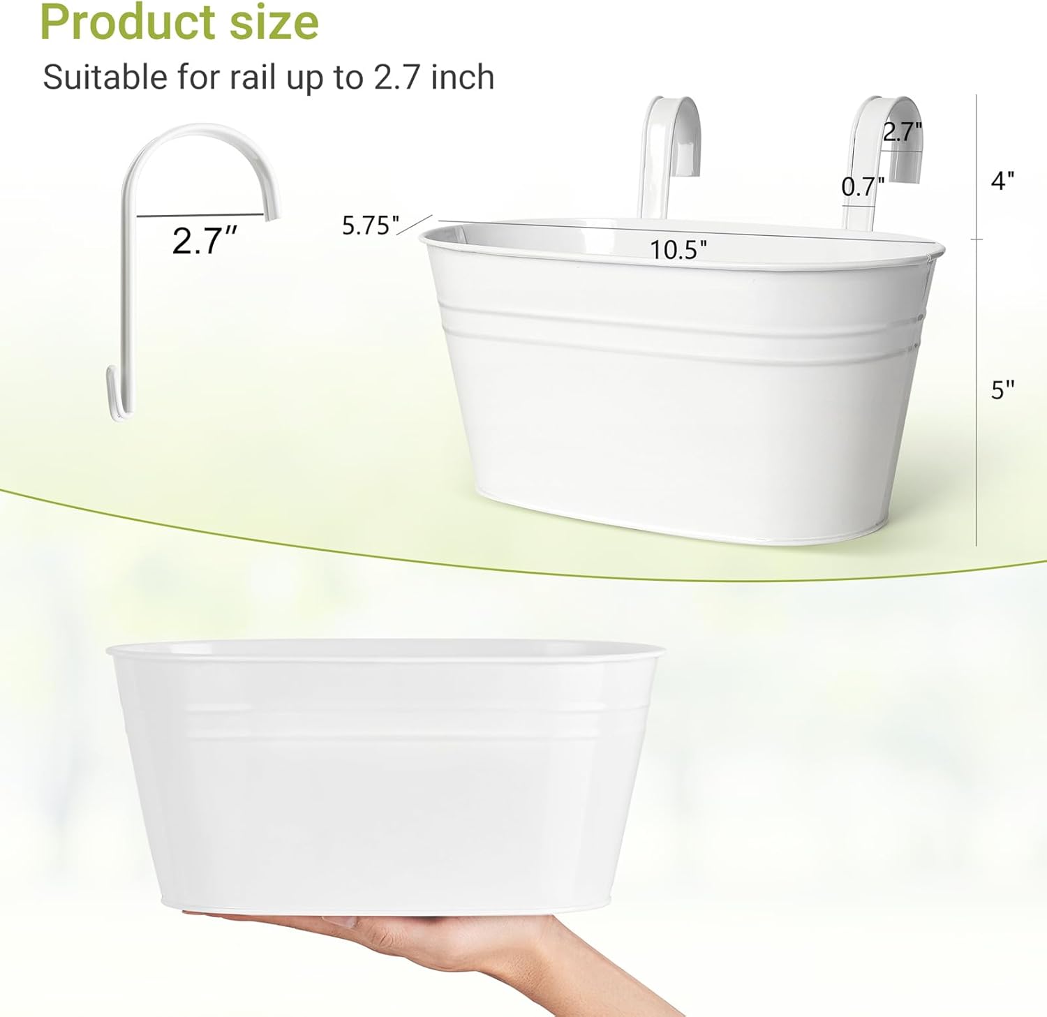 - Size:Planter:10.5" x 5.75" x 5". Hook is 4" x 2.7β x 0.7"(Suitable for rail up to 2.7 inch). Please check the size carefully before purchasing. Pay attention to:The hook is disassembled for transportation,you need to install the iron bucket yourself when it arrive.