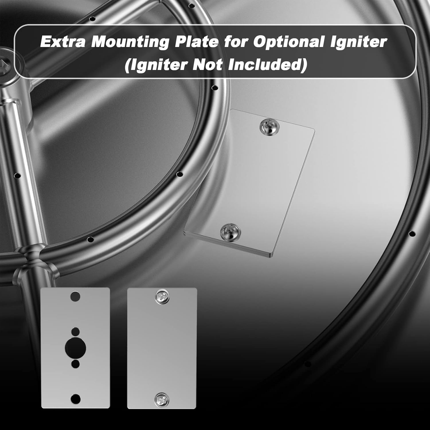 - Male 1/2 inch gas inlet in bottom center of pan for easy Installation; extra mounting plate for optional igniter (igniter not included). Built-in weep holes in the pan to prevent water accumulation.