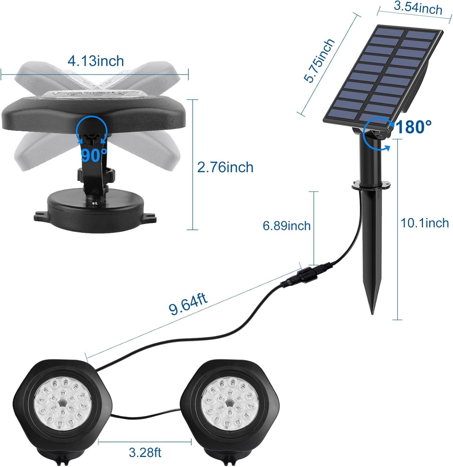 - 2-in-1 Solar Outdoor Lights Features: Adjustable, Brighter & Longer Wire. The light heads can be adjusted 90 degrees. One light have 18 LED beads, total 54 LED, Super bright, comes with 13ft/4m wire, more flexible and convenient to use. Low voltage and anti-leakage. IP68 protection level, suitable for outdoor use as landscape spotlights , can withstand harsh weather. It can also be used in indoor aquariums and ponds