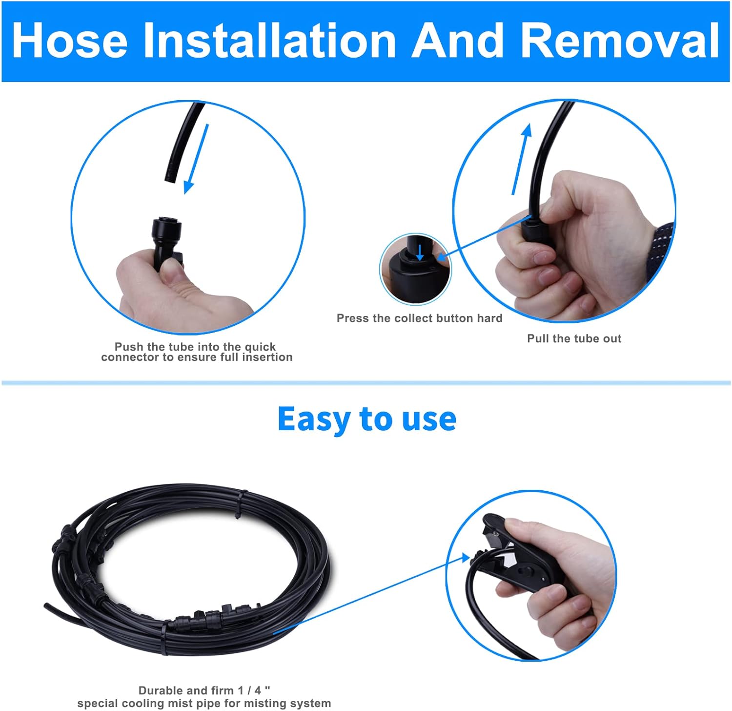 - [Easy to Install]: Our misting system is pre-assembled, you just need to twist the 10/24UNC nozzle into a 1/4" tee and put the end of the mist hose into tap water, turn on the power.while equipped with DIY tools for different needs.
