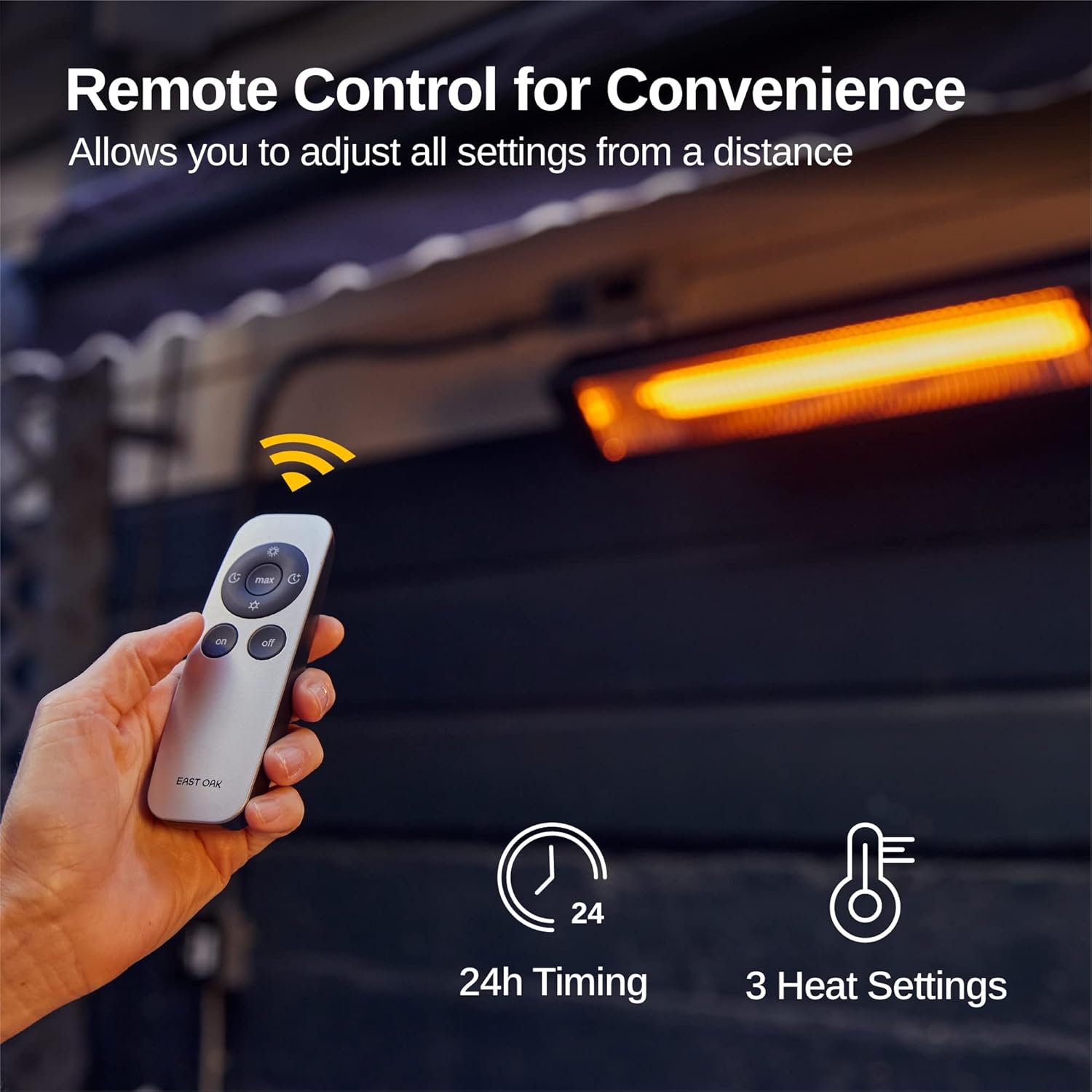 - 3 HEAT SETTINGS & 24H TIMING BY REMOTE: You can control the heater without moving. This patio heater has three heat settings (2000W-2400W-3000W) and a 24-hour timer to meet your different needs. High heat setting is more suitable for balcony and patio, while low heat is ideal for indoor use