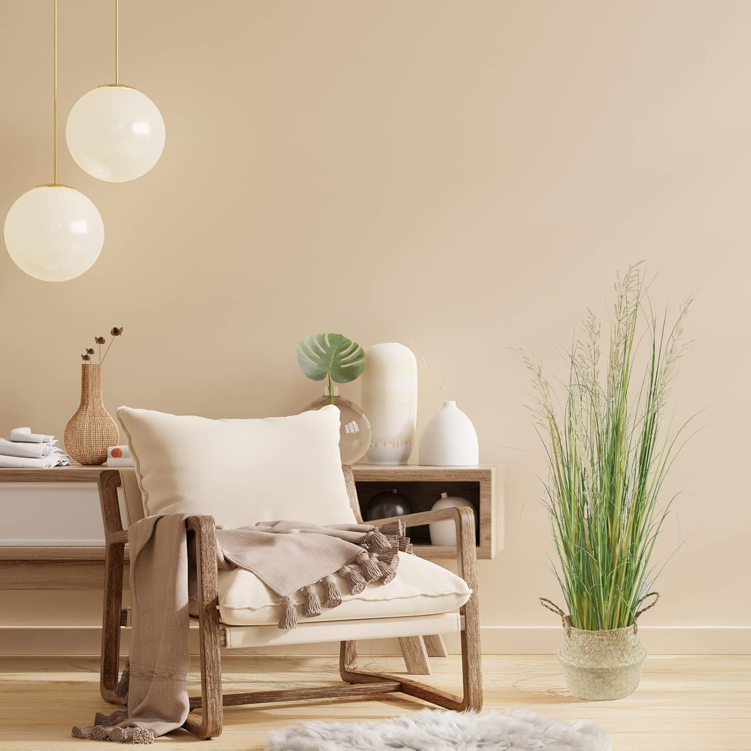 - 1.This faux plant features close to natural green grass with 5 white silk reed flowers, all inside a durable and solid flowerpot. Artificial pampas grass is 47 inches high.base with a black plastic pot in 5'' dia ,5.9''high.itβs easy to put it in a nice bigger planter as desired.