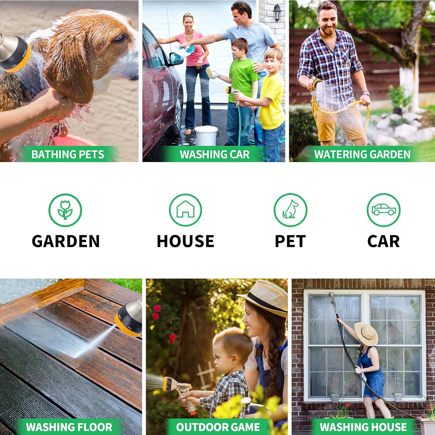 - 【Wide Application】The garden nozzle is suitable for a wide range of applications, including watering plants, washing cars, cleaning windows patio furniture, pet showering and more. The nozzle's high-pressure jet setting can easily clean dirt and grime, while the soft shower setting can gently water delicate flowers and plants in the garden bed. You can use it in your home, garden, or garage, making it a versatile tool that you'll reach for time and time again.