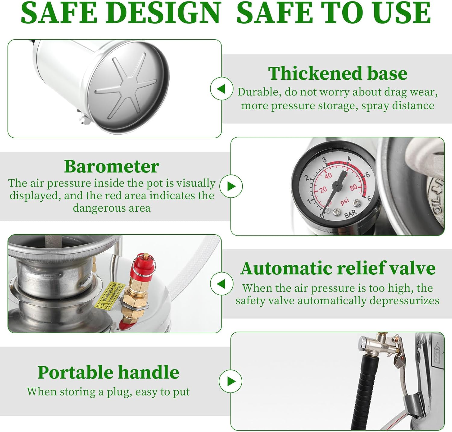 - 【SECURITY VALVE】- The barometer on this sprayer can intuitively see the state of pressure inside the tank. Come with a security valve that makes it automatically release internal pressure when the pressure is too high, keeping the pressure in a secure range