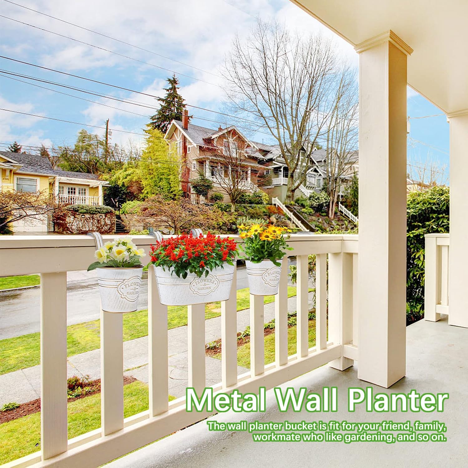 PerGar Vintage Metal Iron Wall Hanging Flower Pots, Rustic Planter Bucket Herb Flower Plant Holder with Detachable Hooks & Drainage Hole for Railing Fence Balcony Deck Garden Home Decoration, Set of 3