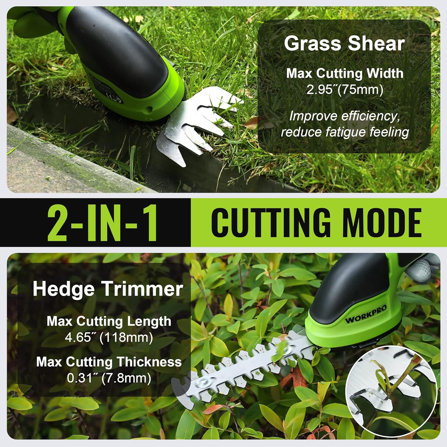 - Upgrade Power Motor: WORKPRO cordless grass trimmer has been upgraded with a powerful motor, and the 2-in-1 design makes switching from mowing to hedges quick and easy. Even if you are a beginner, this hedge trimmer has everything you need for your pruning needs