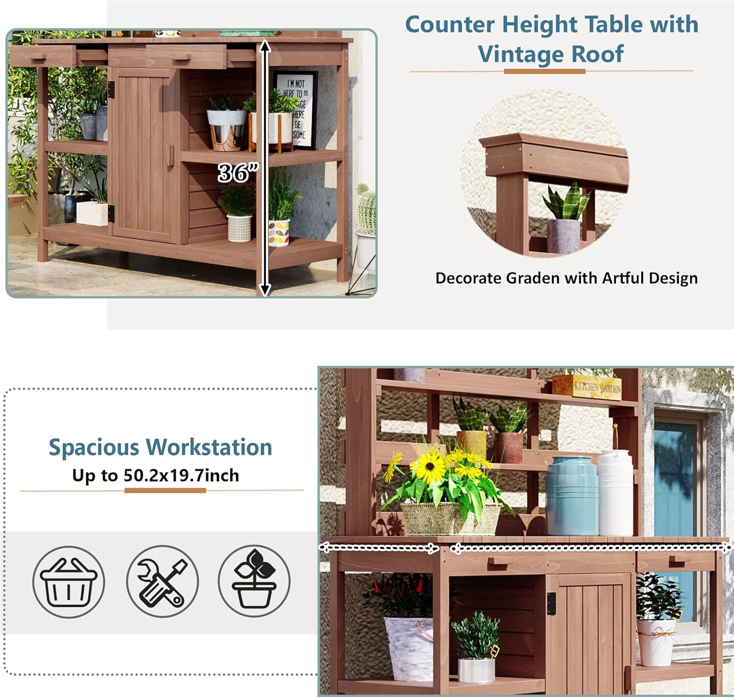 - Large Workspace: Once you have a potting table you will wonder why you get it now. Made of 100% fir wood, this potting bench is with larger workstation which is up to 50.2x19.7inch so it will provide lots of work room. All tools are in handy and it can also be an artful place to show your garden stuff.