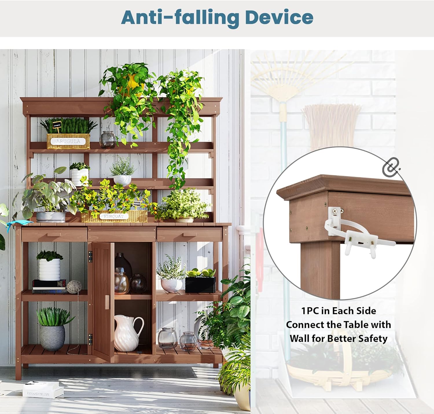 - Anti-Falling Safety Device: There is not always a flat in the garden. For your safety in setting the potting bench, it is designed with an anti-falling device. Just connect the device to the wall for better safety.
