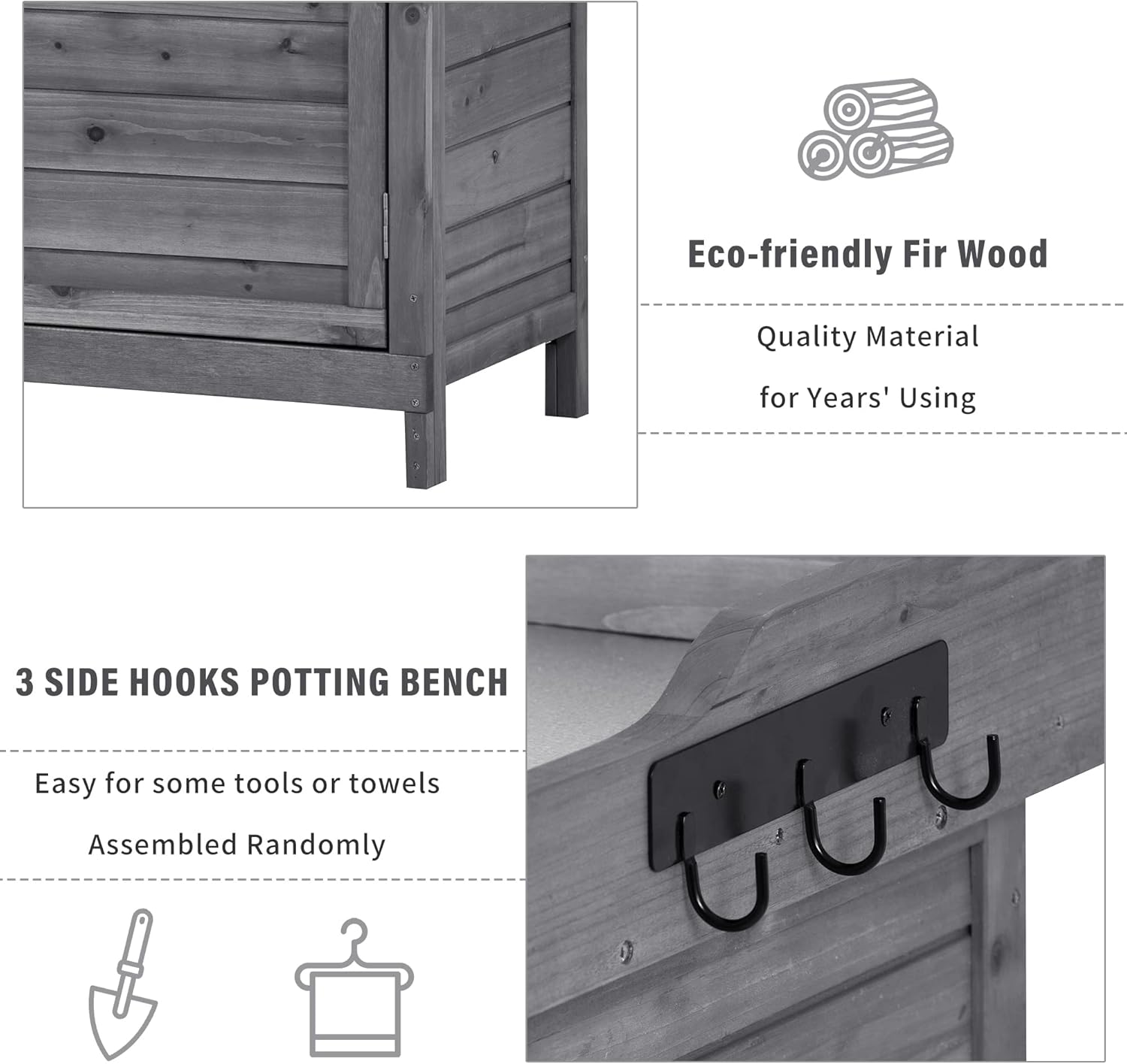 Merax Outdoor 39" Potting Bench Table, Rustic Garden Wood Workstation, Storage Cabinet with 2-Tier Shelves and Side Hook, Grey