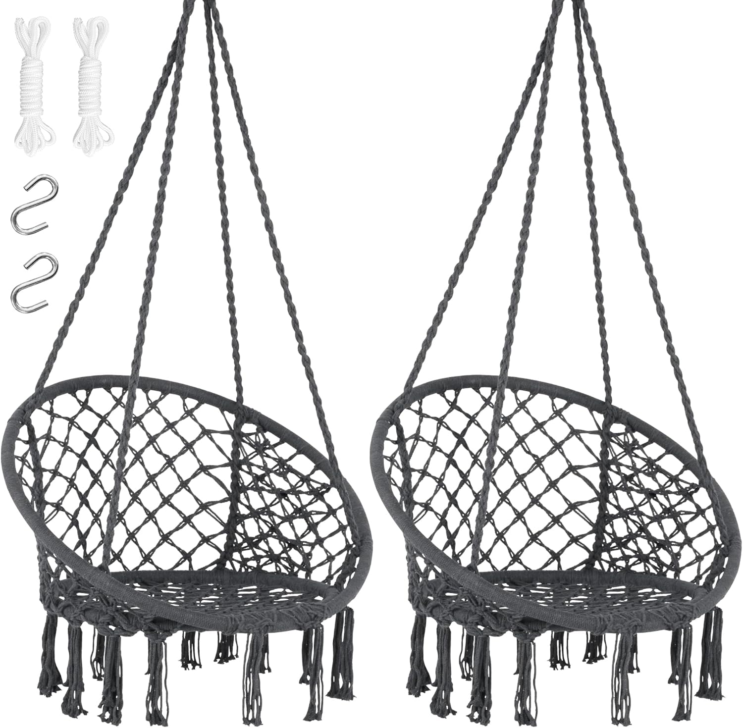 SUNCREAT Hammock Chair Hanging Macrame Swing with Hardware Kits, Max 330 Lbs, Handmade Knitted Mesh Rope Swing Chair for Indoor, Outdoor, Bedroom, Patio, Yard, Garden, Pack of 2, Grey