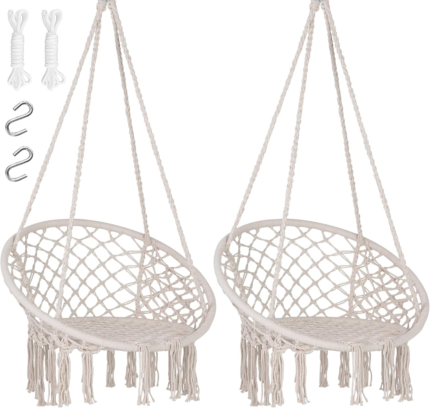 SUNCREAT Hammock Chair Macrame Swing with Side Pocket, Hanging Cotton Rope Hammock Swing Chair for Indoor and Outdoor Use, 330 lbs Capacity, Pack of 2, Beige