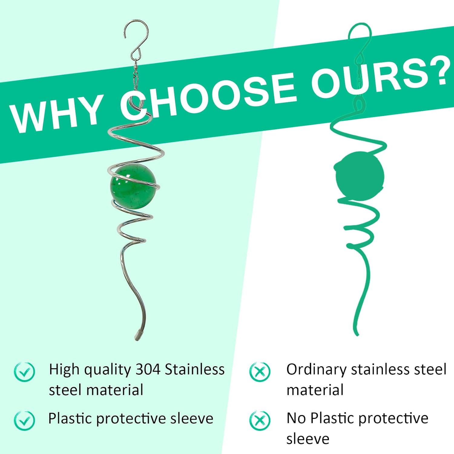 - ✔【Easy to use】The spiral tail wind spinner can't spin by itself ,if you want to make it spin like the video ,need add 1pc motor (not include) ,or combine it with a wind spinner or any rotatable hanging ornament to help it rotate. Come with 1pc 2 inch green glass orb(not paint),1pc silver color spiral tail twister,and 1pc swivel hook accessory, ready to hang and enjoy.