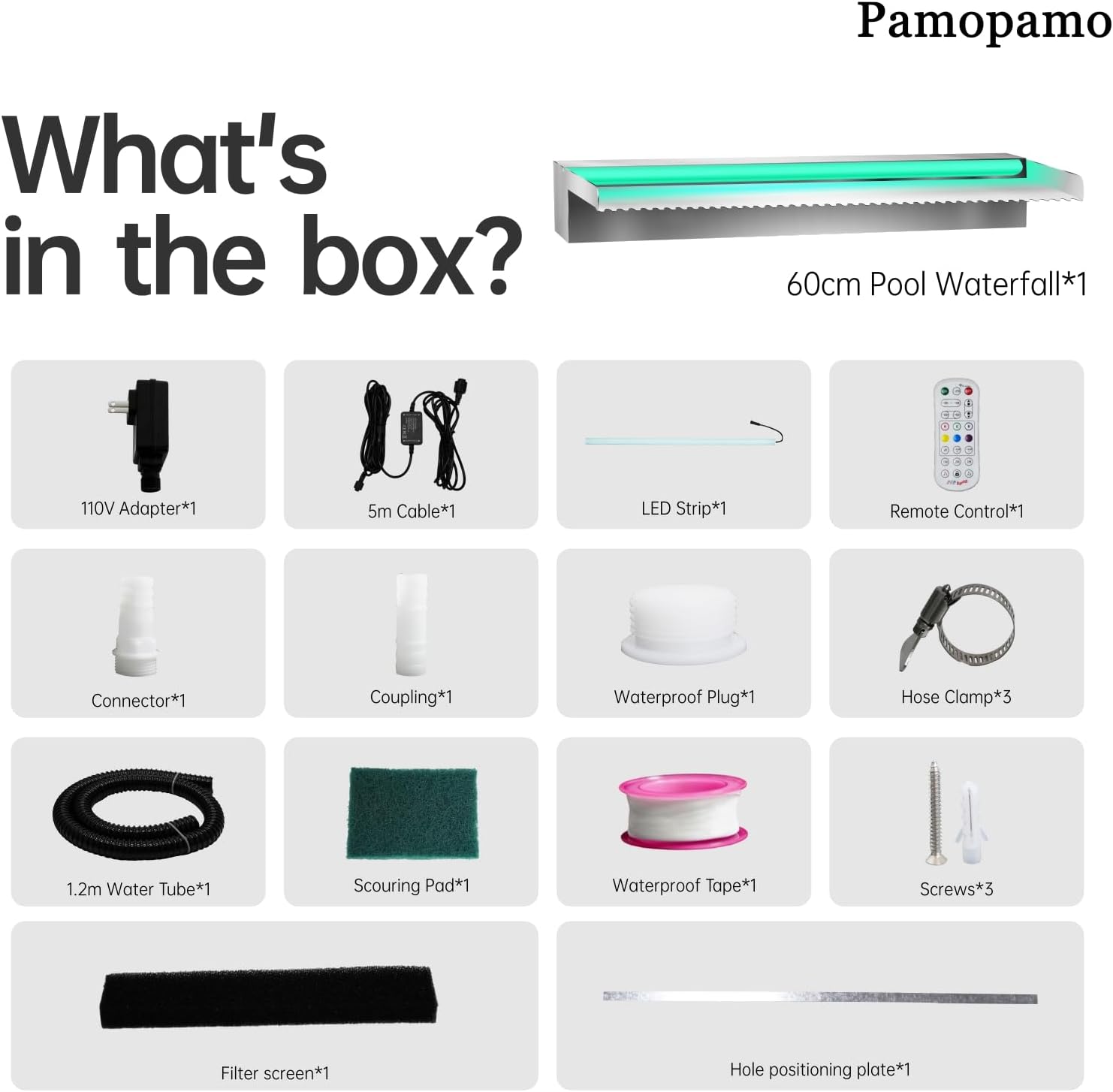 - ⏩Decoration Pool Waterfall⏪ Pamopamo waterfall spillway makes your garden swimming pool and koi pond elegant, fashionable and beautiful. The color change of LED lights and the gentle sound of water running make your patio more special at night.