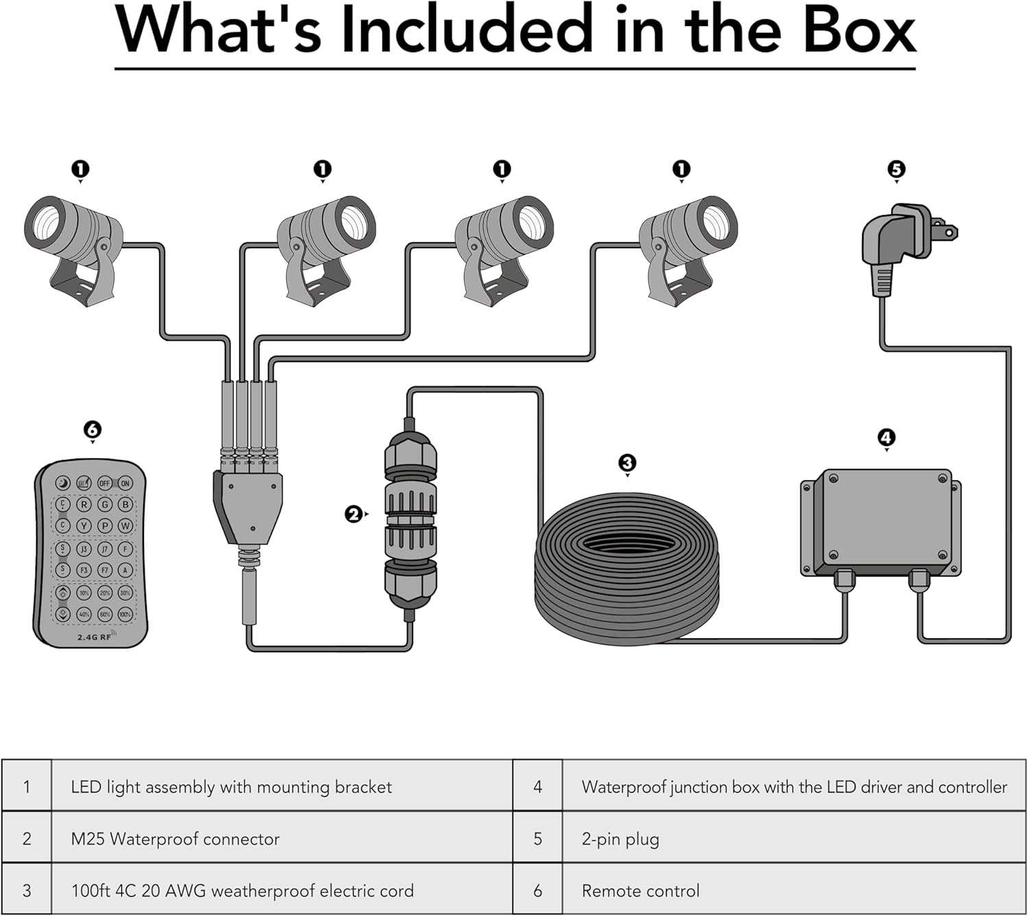 - RGB Color-Changing LED Fountain Light Sets. One remote control and one outlet timer included.