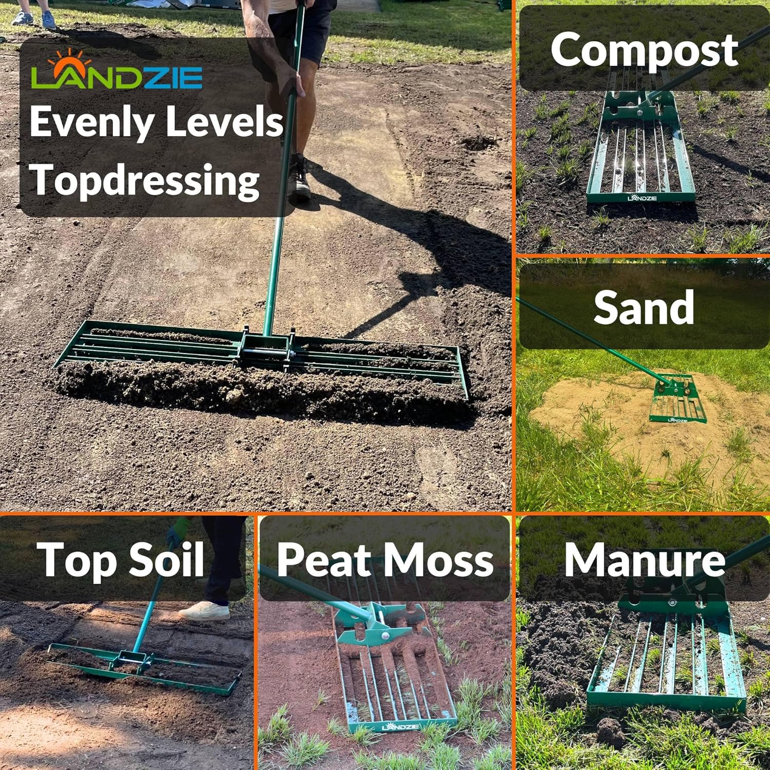 - LEVEL YOUR YARD THE LANDZIE WAY: The Landzie Lawn Leveling Rake is a must-have in your tool shed or garage this season. The Landzie yard leveling rake stays flat against the surface of your lawn and can level the soil more quickly and effectively compared to other lawn leveling tools on the market. Landzie makes it easy for you to maintain a level, beautiful lawn while conserving your time and energy. Lawn care will never be the same again.