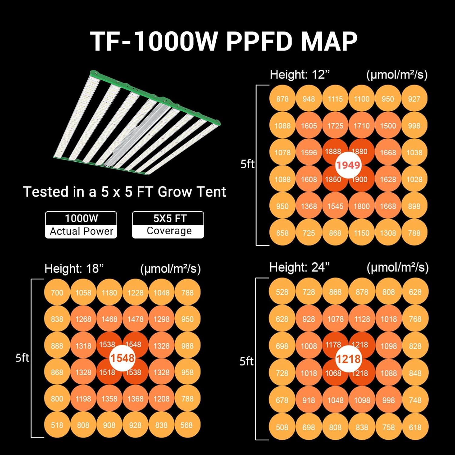 - Enhanced size and uniform PPFD: Growline1000’s enlarged frame ensures light is distributed more evenly, reaching the farthest corners of your plants. By placing diodes at the end of each strip, it provides balanced intensity, promoting healthier, more uniform growth.1000W Commercial Grow Light is designed to cover a 5x5 grow area, ensuring even light distribution, high brightness and low temperature.