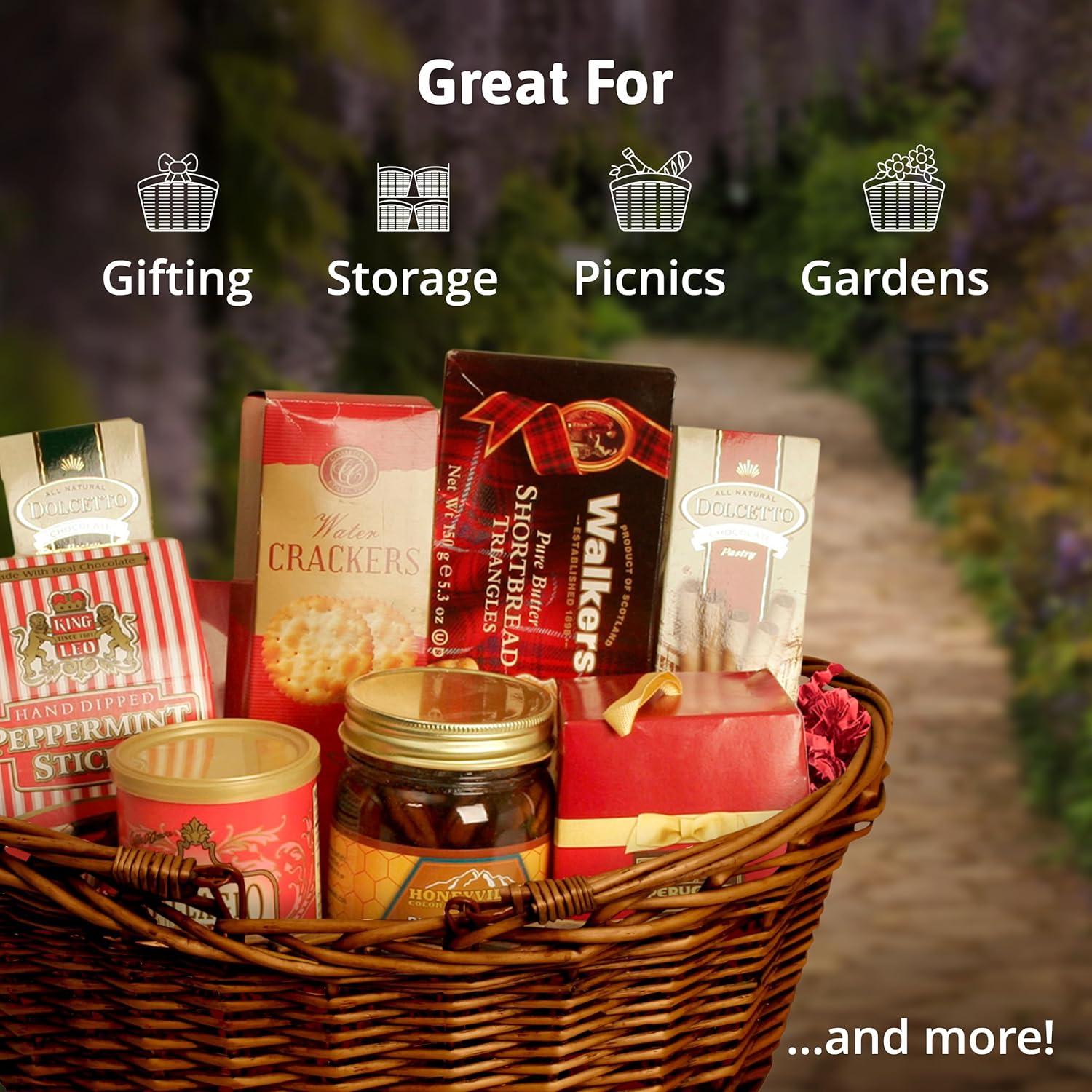 - WICKER BASKET: Create an attractive gift basket for family and friends. Our willow picnic basket has folding handles that fold down for storage or up for easy carrying, so you can take it with you anywhere or use it as storage and organization for household items.