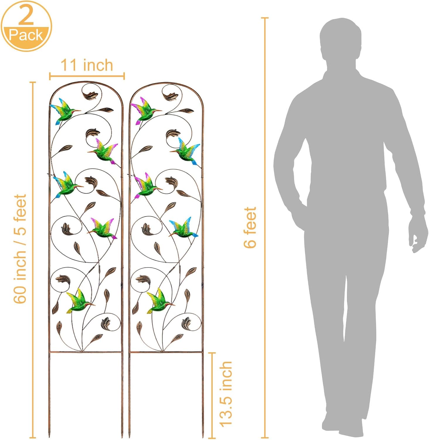 - 【Dimension】2 Pack, overall dimension of each trellis features 60 inch high and 11 inch wide, proper size for in the small planting pot or lower shrubs. 13.5 inch ground spikes allow to stake anywhere study. It’s perfect for Jasmine, Climbing Roses, Creeper, Passiflora, Morning Glory, Hydrangea.