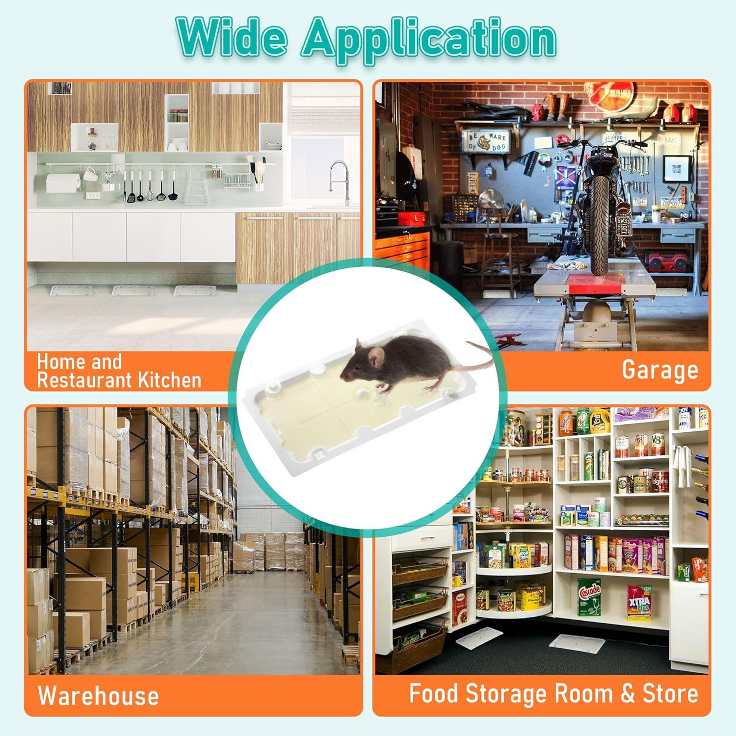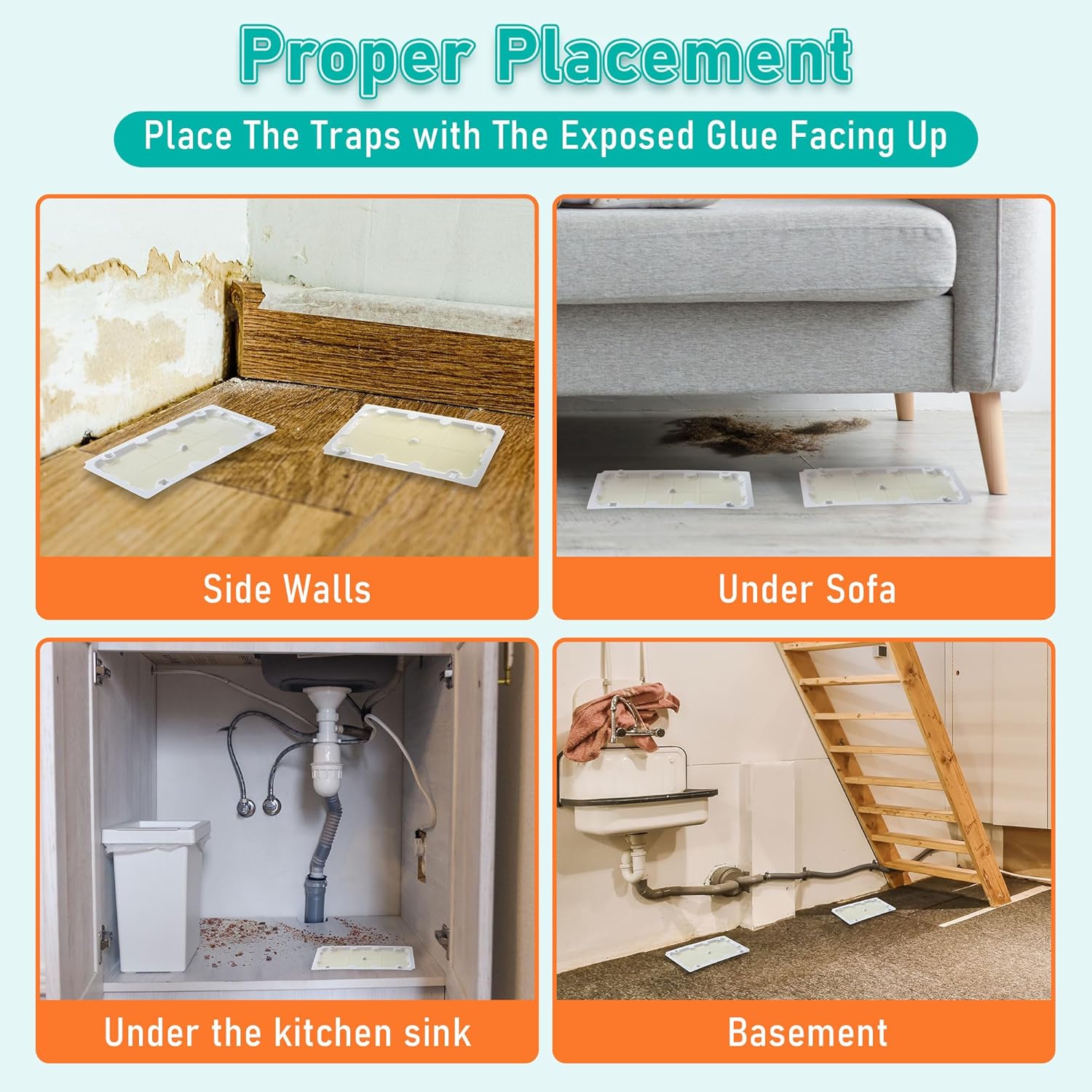 - Pest and Mouse Sticky Traps: sticky traps for mice can catch not only mice but also other common pests in your home, and we suggest you position sticky traps along active rodent runways, such as along walls, under large kitchen appliances, in cupboards, and other areas where rodents travel, be sure to fit the glue trap flush against a wall where rodents will run over and stick to it; And cold weather Qualirey glue traps for mice and rats can withstand 0Β° Fahrenheit weather