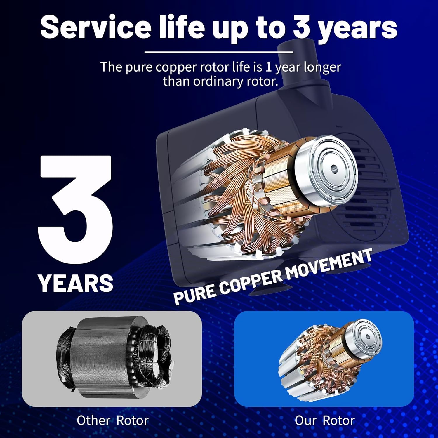 - 【Quality & Ultra Quiet】In order to keep the pump quiet and has a longer service life, increased the cost by using high quality rotor and copper,makes the pump quiet & has longer life than others.