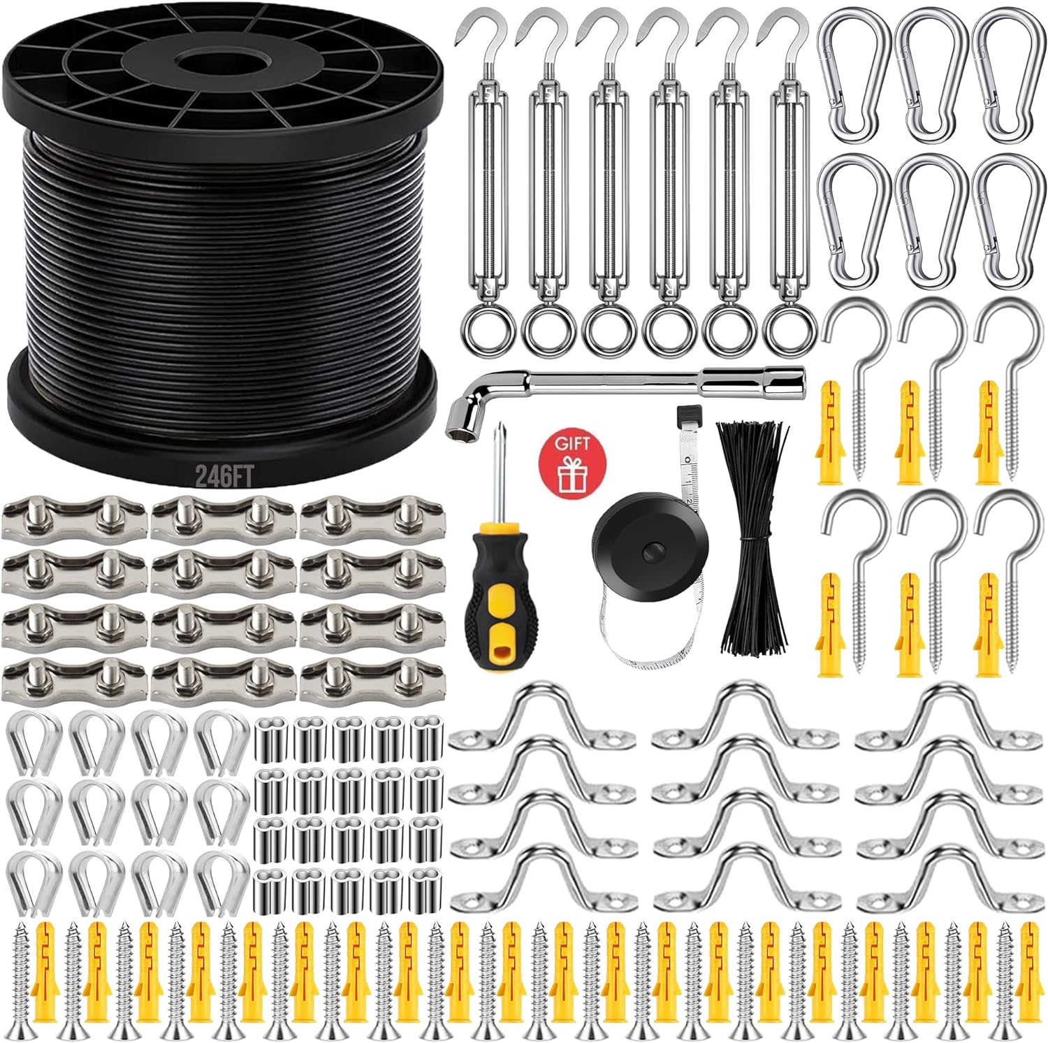 - 【Multi-purpose Cable Kit 】:Suitable for Sun Shade Hardware Kit , Garden Wire for Climbing Plants,Clothesline Wire, Suspension Wire Kit,Globe Lights Hanging, Espalier Wire Kit,Guy Wire Kit,Gate Tensioner Cable Kit,Curtain Cable Wire System ,Outdoor Applications of Tent Rope, Deck Cable Railing and etc.