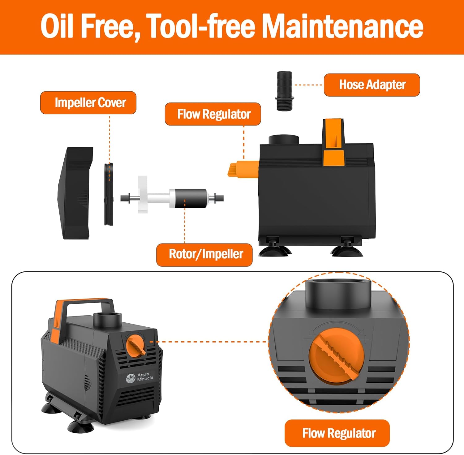 - HANDY AND EASY TO MAINTAIN β 1. This fountain pump is designed with a handle for ease of carry. 2. Lubricant free and no special tool is needed for maintenance. Simply pull to detach the front screen from the submersible water pump and rinse the components with water.