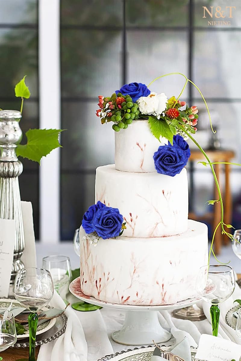 N&T NIETING Artificial Flowers Glowing Navy Blue Flowers Foam 25pcs Glitter Roses Real Looking Fake Roses with Stem for DIY Wedding Bouquets Centerpieces Bridal Shower Party Home Decorations
