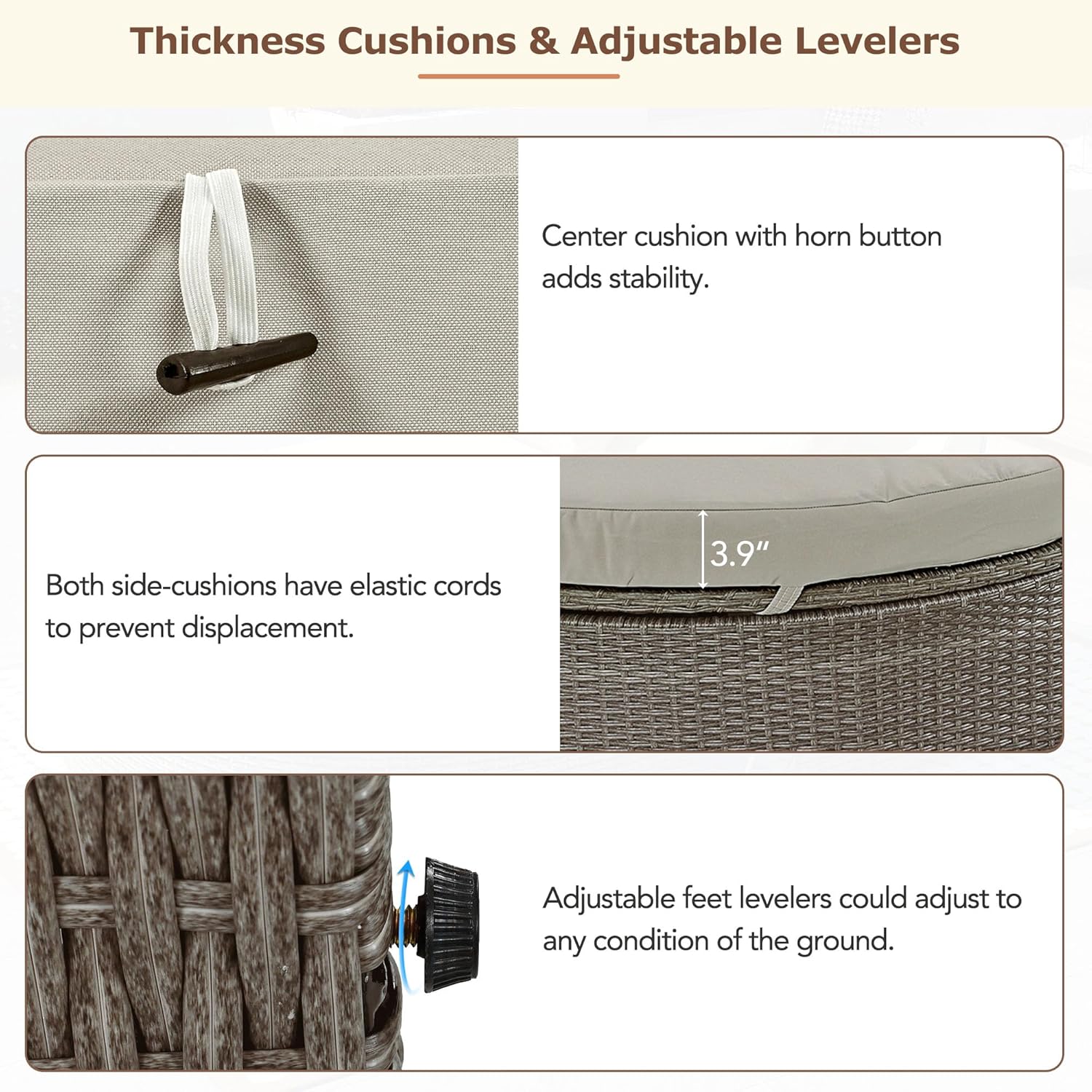 - π Thickness Cushions: The backs of the cushions on both sides are attached to the rattan frame with elastic cords to prevent displacement during use. Horn buttons are incorporated into the cushions at the center section for added stability, ensuring that the cushions stay firmly in place. Adjustable feet levelers could adjust to any condition of the ground.