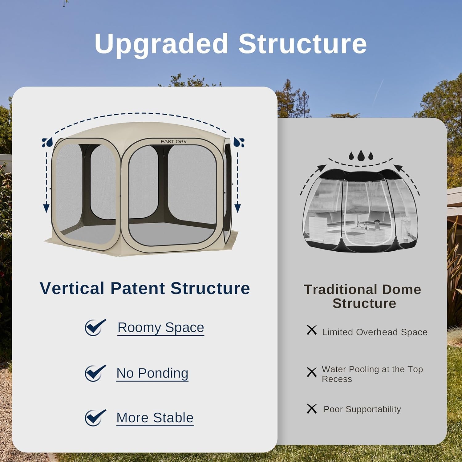- ๐๐ป๐ท๐ผ๐ ๐ฌ๐ผ๐๐ฟ ๐ข๐๐๐ฑ๐ผ๐ผ๐ฟ ๐๐ถ๐ณ๐ฒ: Creating a more comfortable and mosquito-free outdoor space is easy with our EAST OAK screen house. It has a hook on the top to hang a lamp, and a light strip can be wrapped around the edge to increase the brightness for use on the darkest nights. Day to night, this is an absolute must-have for the patio, camping, picnics, parties, backyard, deck, and even kids' parties! NOTE: Pendant lights need to be purchased separately