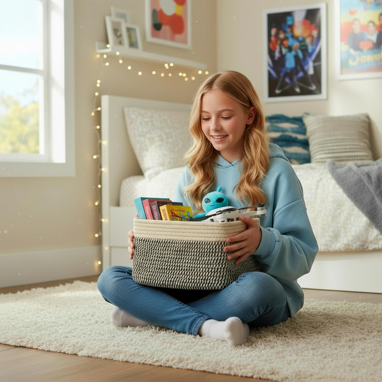 - Durable Rope Basket Design:Handwoven from premium cotton rope, offering a sturdy yet soft construction that is safe, eco-friendly, and long-lasting.