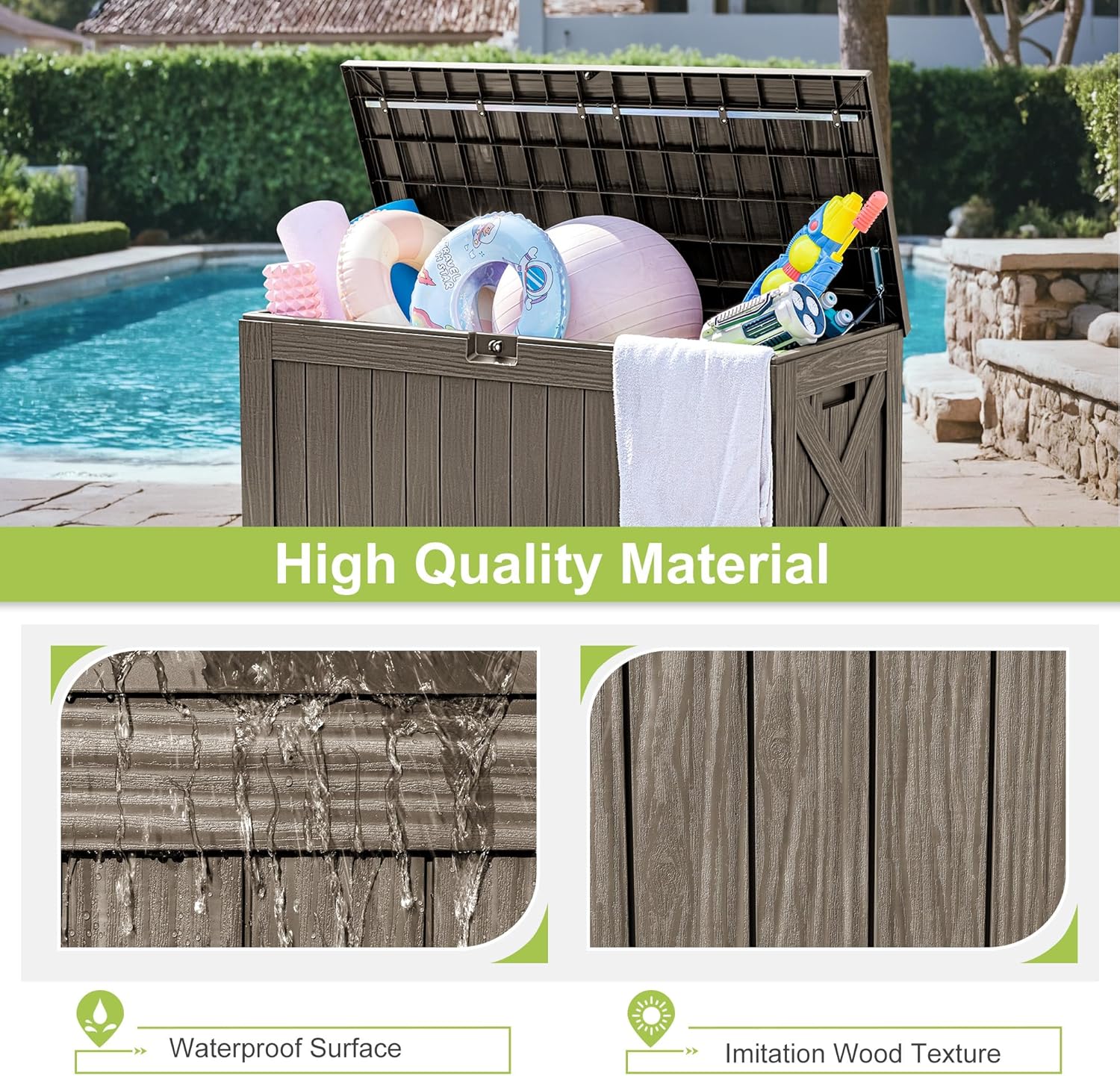 - Good Appearance: There is clear wood grain on the surface of the deck box, which makes it more decorative. Ancient and rustic appearance ensures that it can be a good part of your garden, patio or swimming pool.