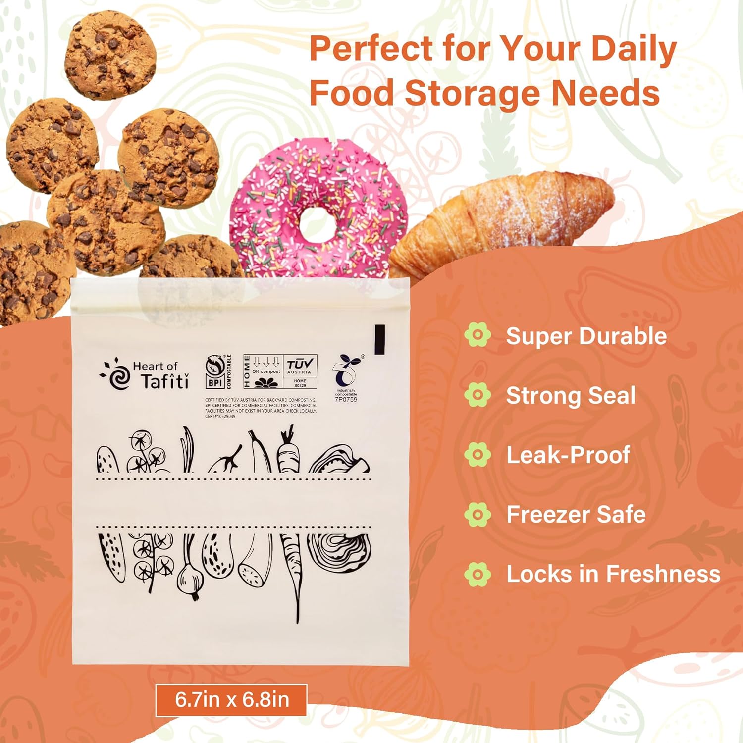 Compostable Food Storage Bags, Resealable Sandwich Bags, 50 Count, 6.7 x 6.8 inches, Extra Thick and Reusable, Eco-Friendly, Certified US BPI ASTM D6400 Europe OK Compost
