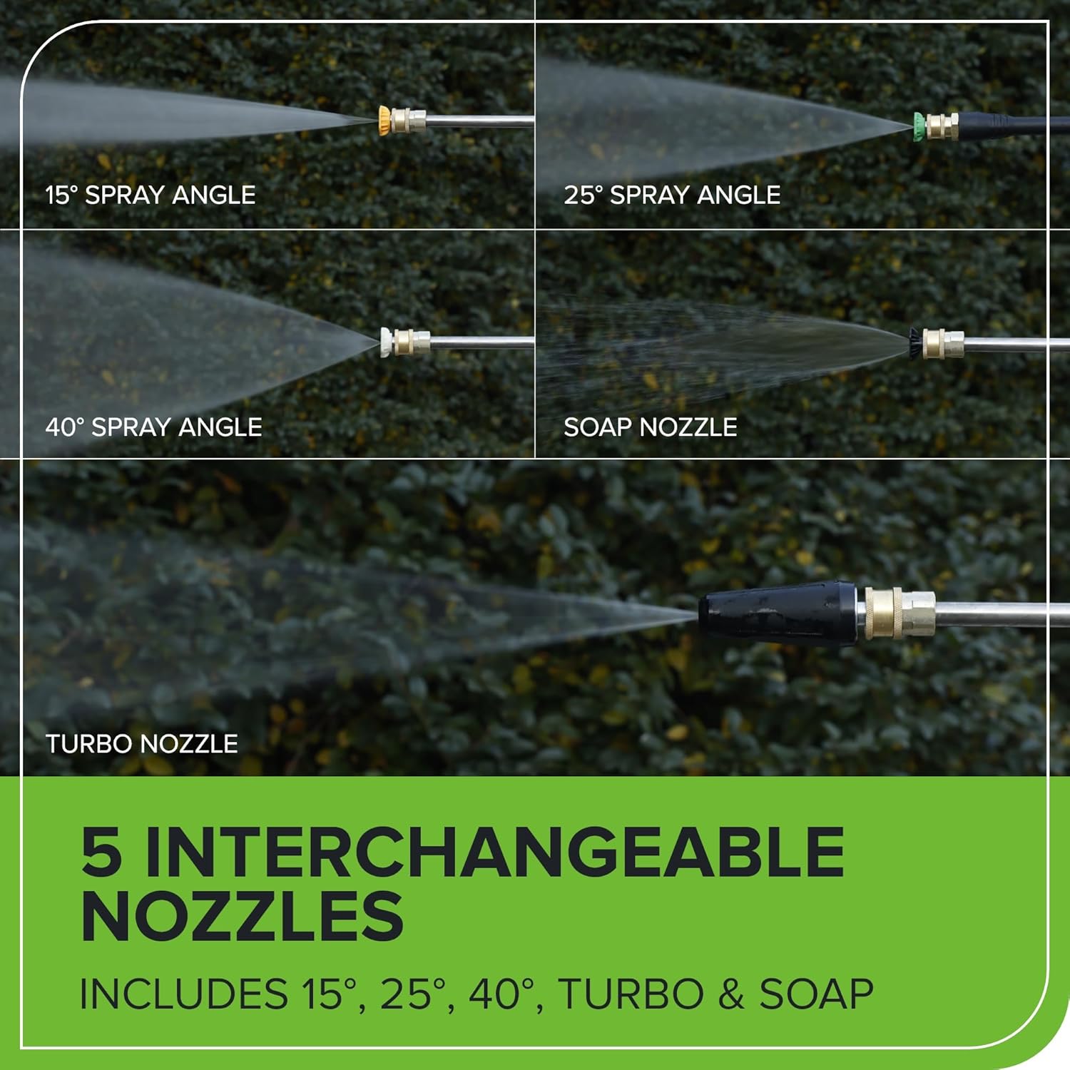 - ACCESSORIES : Equipped with rugged metal gun and hassle-free 25-FT Uberflex kink-resistant hose; 15°, 25° and 40° tips, soap and turbo nozzles included