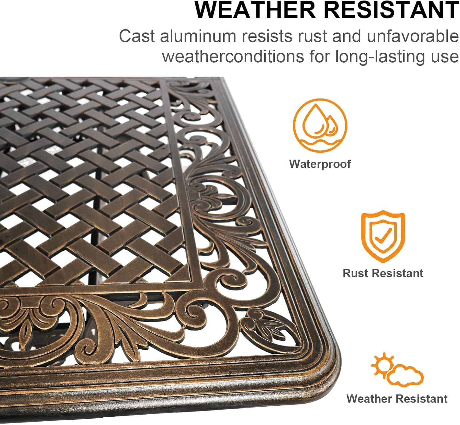 - Widly Occassion: This cast aluminum patio dinning set is with fashional woven design, which come with any stylish patio. Outdoor table and chairs takes you on a relaxing holiday in deck, yard, balcony, garden, lawn, front porch, pool.