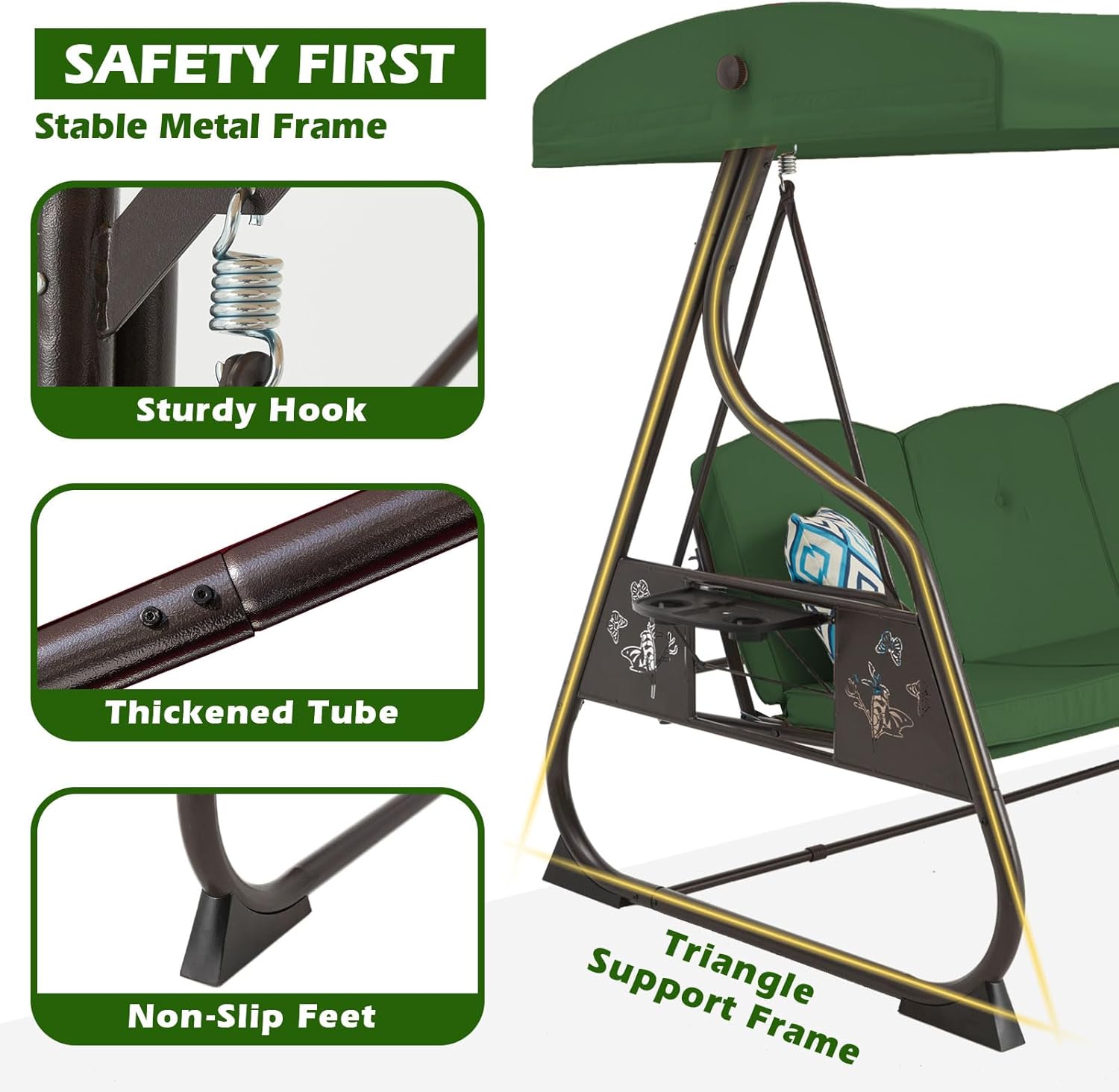 3-Seat Patio Porch Swing 800LBS Outdoor Swing with Stand w/Canopy & Adjustable Backrest Patio Glider Chair w/Removable Pillows & Foldable Side Tray for Balcony Garden Deck (Green)