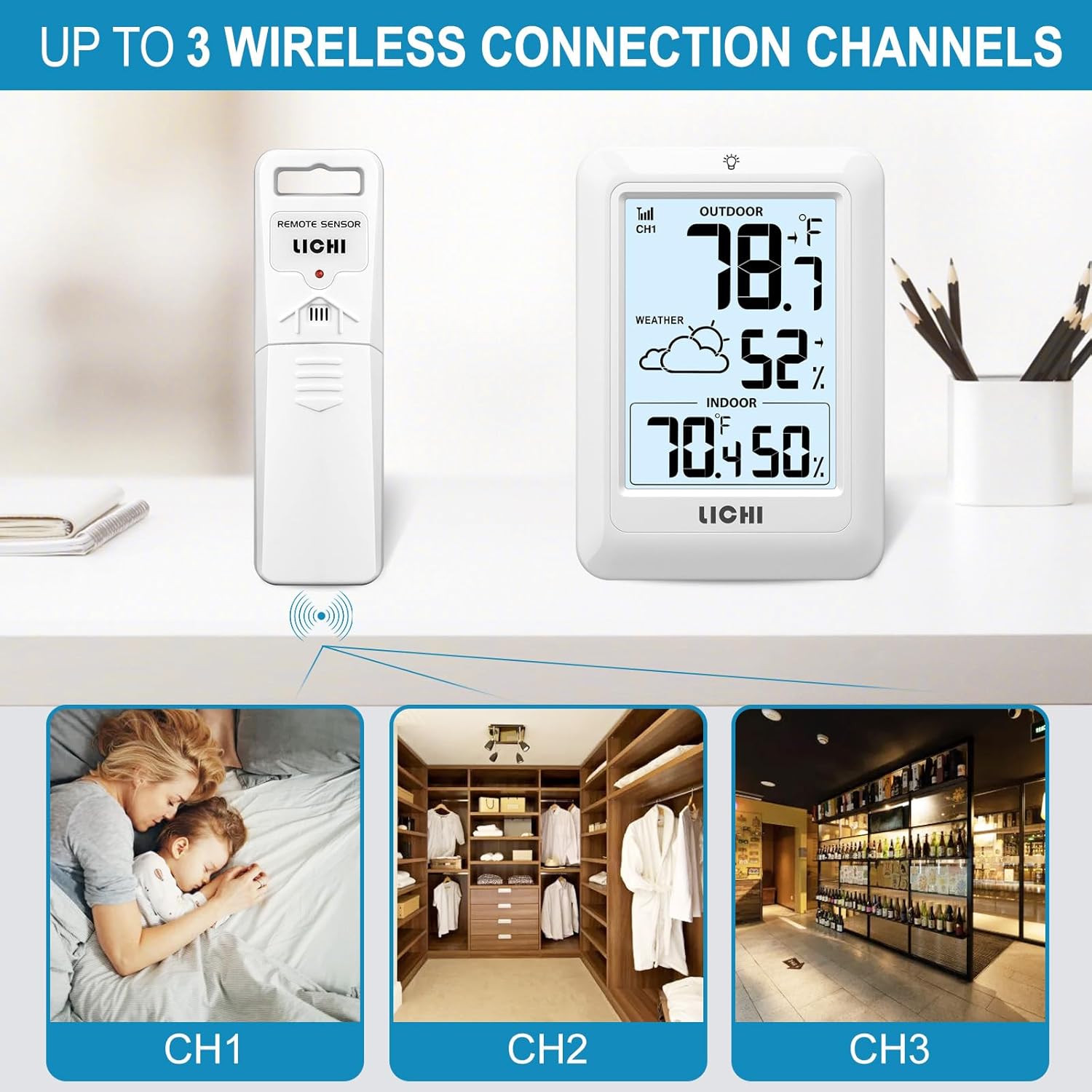 Indoor Outdoor Thermometer Wireless Weather Station, Internal External Thermometer Hygrometer, Home Batteryoperated Temperature Humiditymonitors330 Feet (About 100 Meters) Backlight Display (White)
