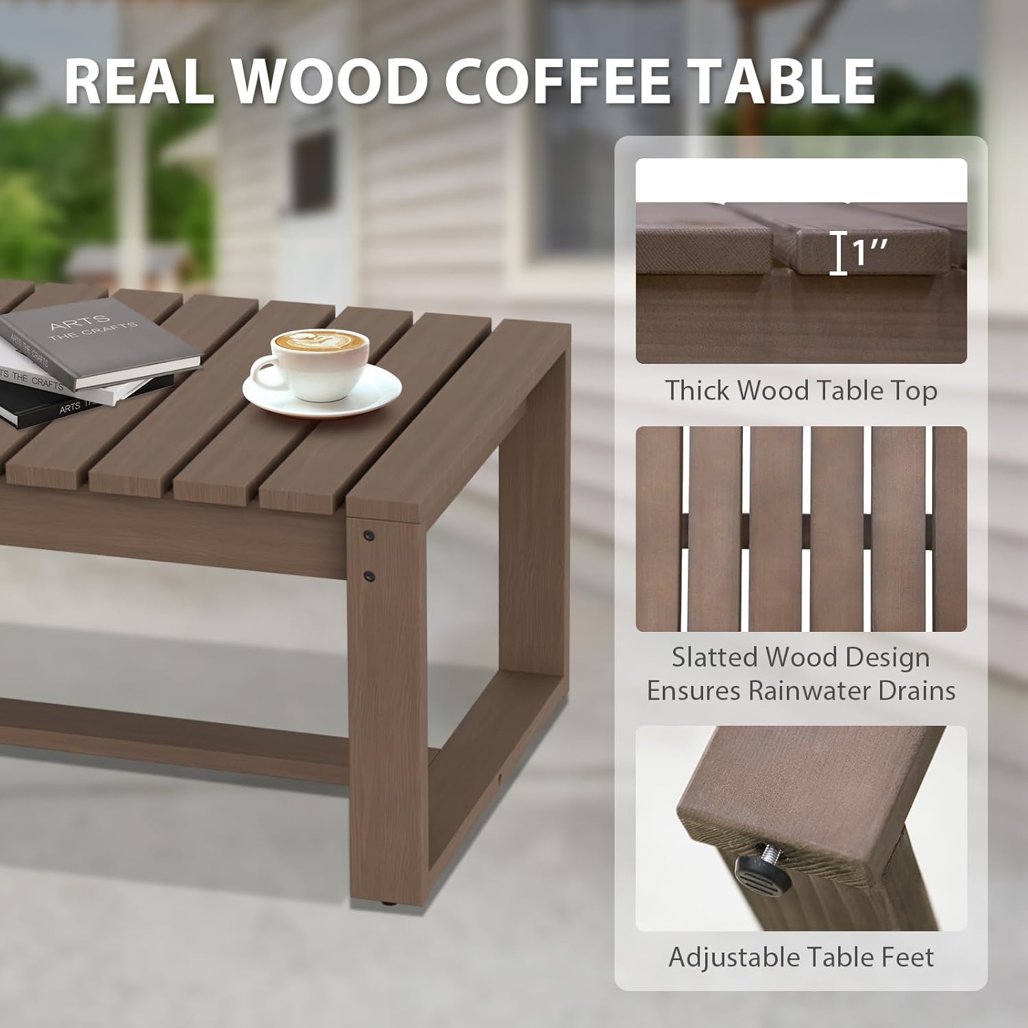 - VERSATILE USE: This conversation set includes a 3 seat sofa and a coffee table. The real wood table has embossed detail that shows the natural hues and the slatted wood design ensures rainwater drains, adding to its outdoor weather resistant quality. Ideal for patios, decks, porches, and poolside areas.