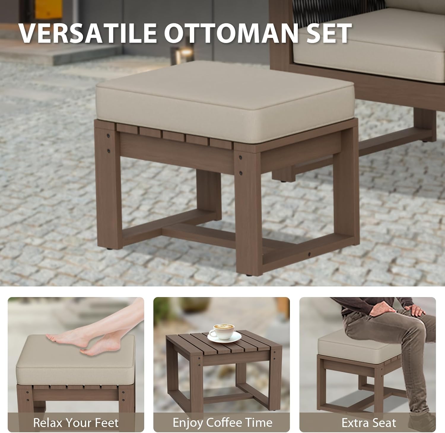 - VERSATILE USE: This conversation set includes a 3 seat sofa, 4 patio chairs, 2 ottomans and coffee table. real wood table is embossed to show the natural hues. It's outdoor weather resistant quality makes it ideal for patios, decks, porches, and poolside areas.