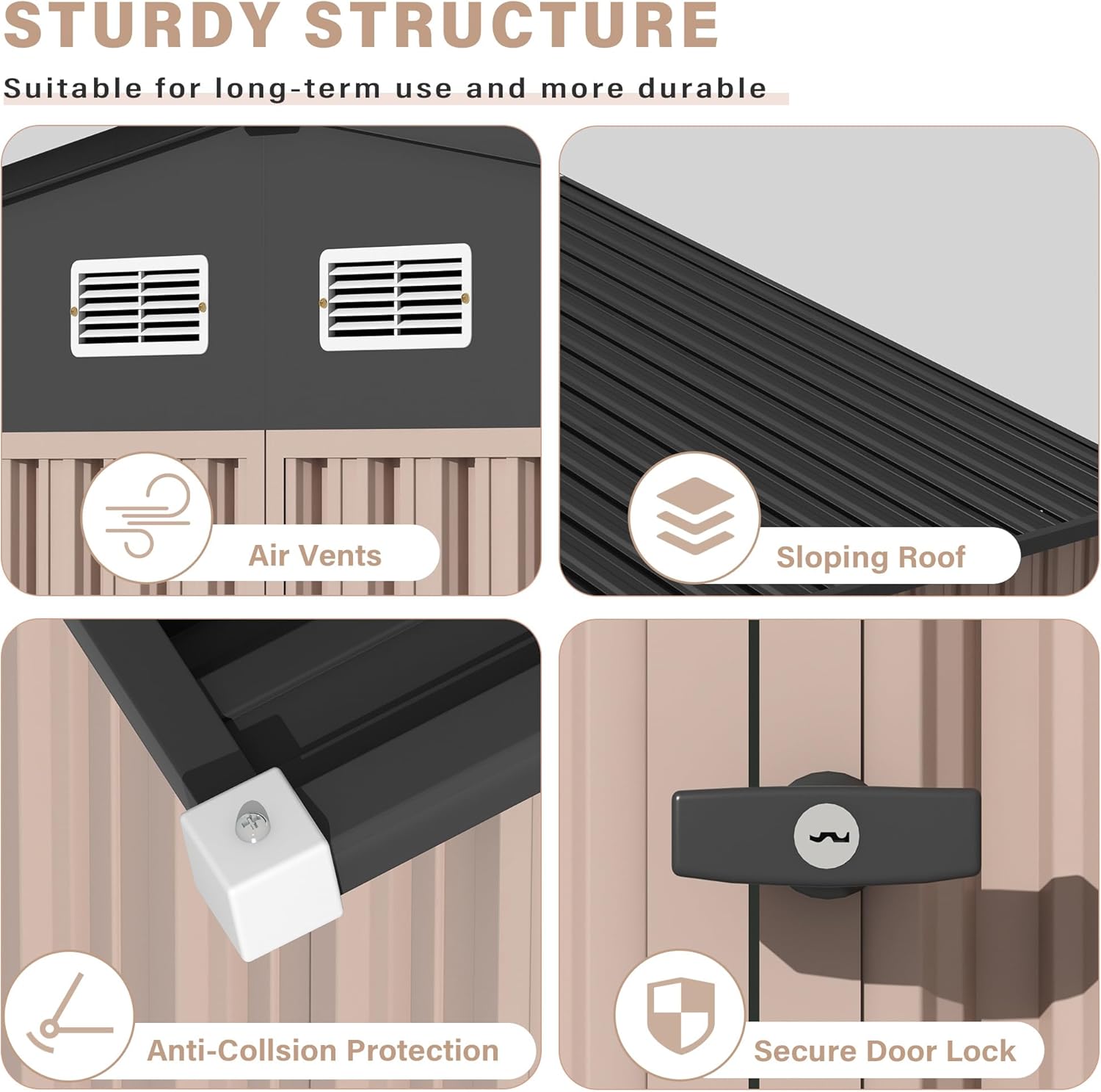 - SLOPED ROOF & LOCKABLE DOOR & AIR VENTS - The sloped roof is designed to let rainwater flow out quickly. The lockable doors can enhance security and prevent strangers or small animals from entering accidentally. The design of air vents can effectively improve air circulation and prevent your items from getting moldy and damaged in humid and hot summers. Plastic protective caps are provided for the sharp corners of the ceiling and each screw to prevent injuries during construction or use