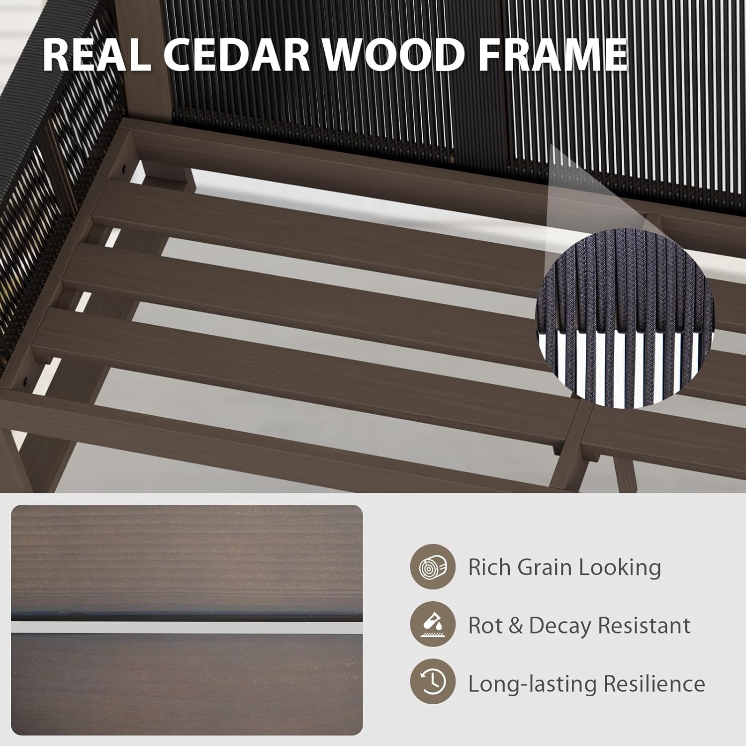 - PREMIUM NATURAL CEDAR WOOD: Crafted with natural cedar wood, this patio furniture set is the perfect blend of strength and style, adding a rustic charm to any outdoor setting. Cedarโs durability makes it resistant to rot, decay, and insect damage, ensuring long-lasting resilience and beauty.