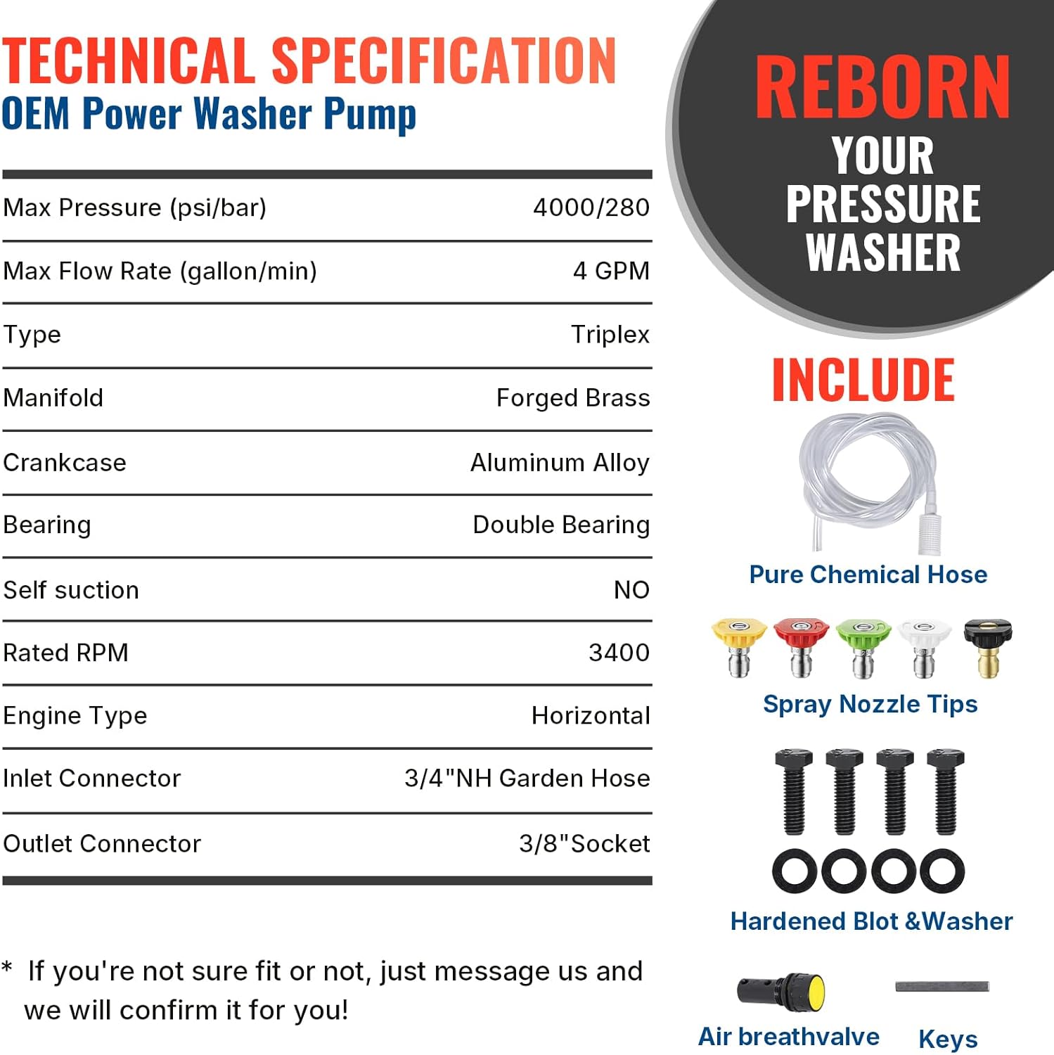 - [Super Powerful] The powerful power combination (4000PSI ultra-high pressure and 4 GPM high water flow rate) can easily break down heavy stains, grease, and deep dust, covering a variety of scenes such as courtyards, vehicles, industrial equipment, etc., significantly improving cleaning efficiency and meeting the needs of professional users.