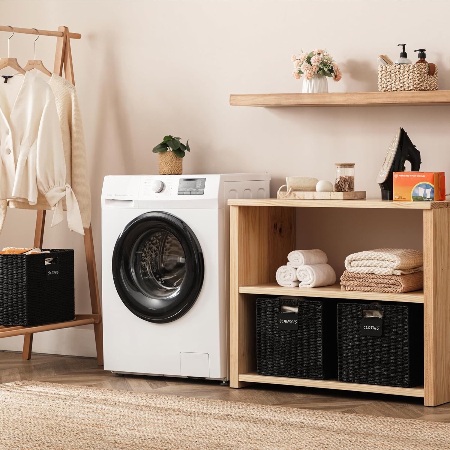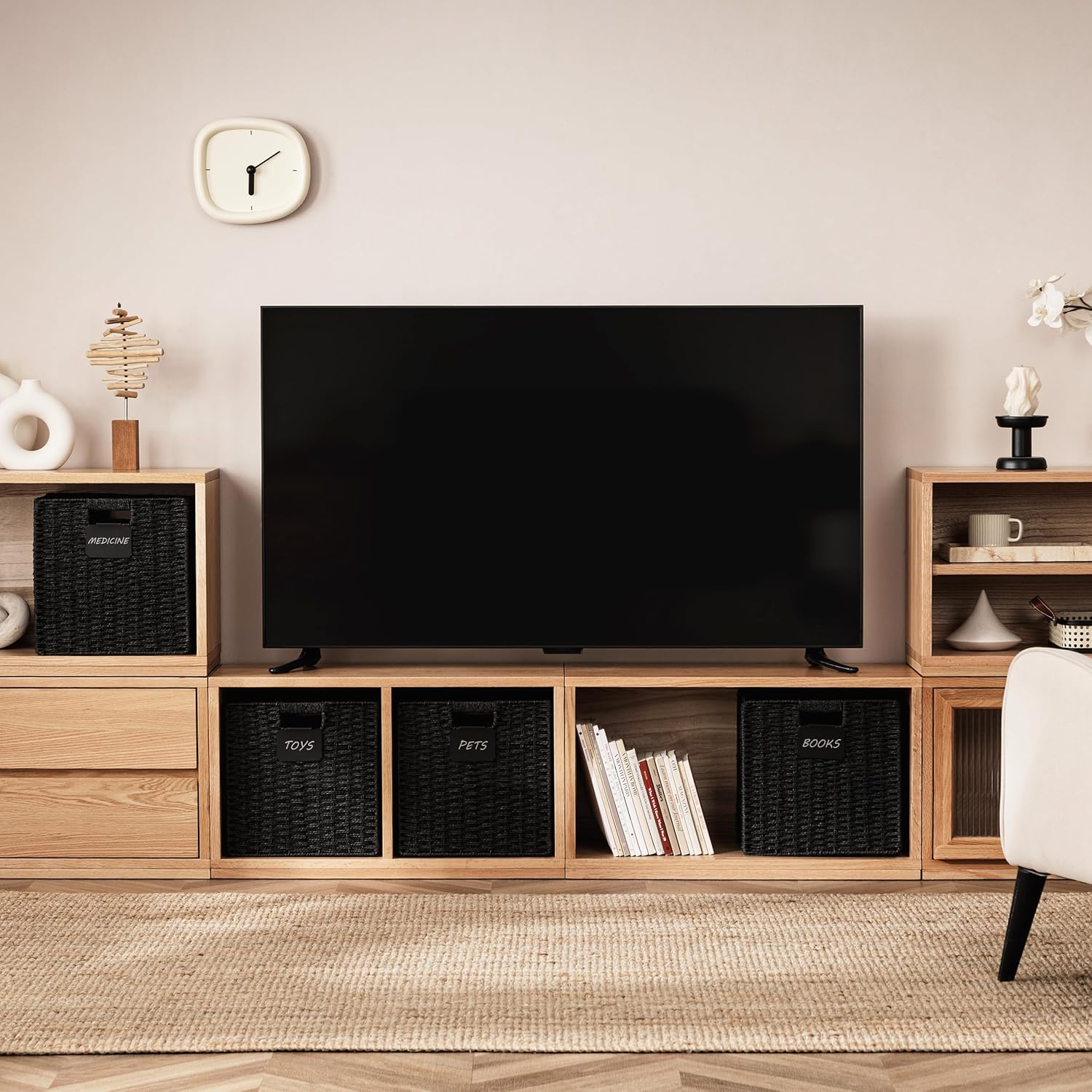 UBBCARE 4 Pack Wicker Basket, 13×13 Storage Cubes with Label, Foldable Cube Storage Bin with Handle, Square Storage Basket for Shelves, Woven Paper Rope Basket for Organizing, Black