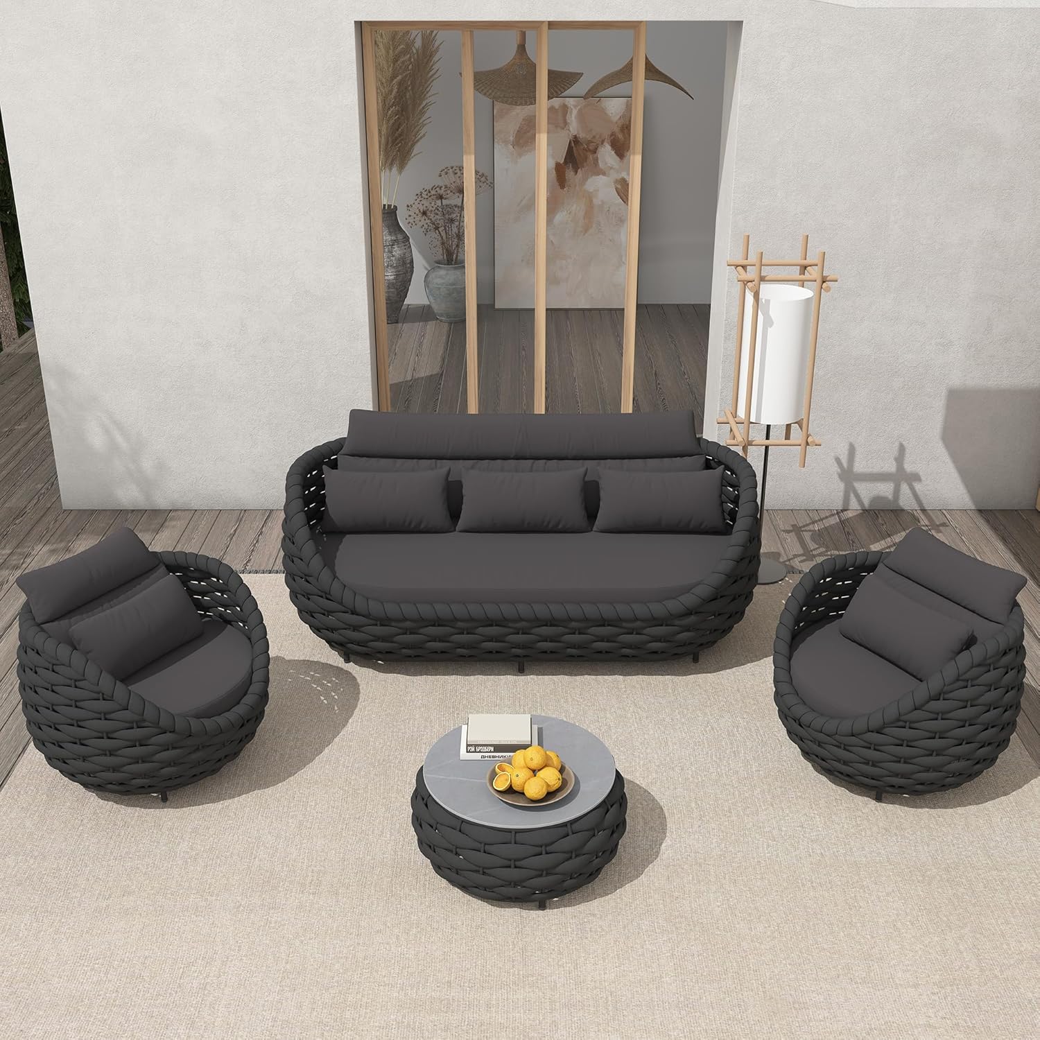 Aluminum Modern Patio Set Three Seater Sofa Outdoor Furniture Set w/Coffee Table,Patio Conversation Set with Hand Woven Teslin Rope for Bedroom Backyard Poolside, Dark Grey