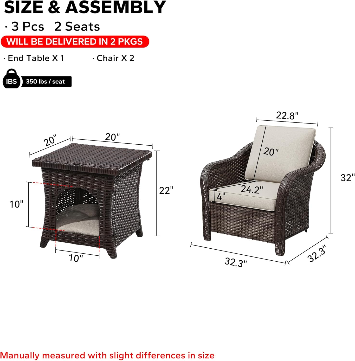 - Packing Included: The 3 pcs set includes 2 x single armchairs, 1 x end table. The tools and instructions needed for installation will also be in the box.The 3 pieces patio dining set will come in 2 boxes. They may come in different days