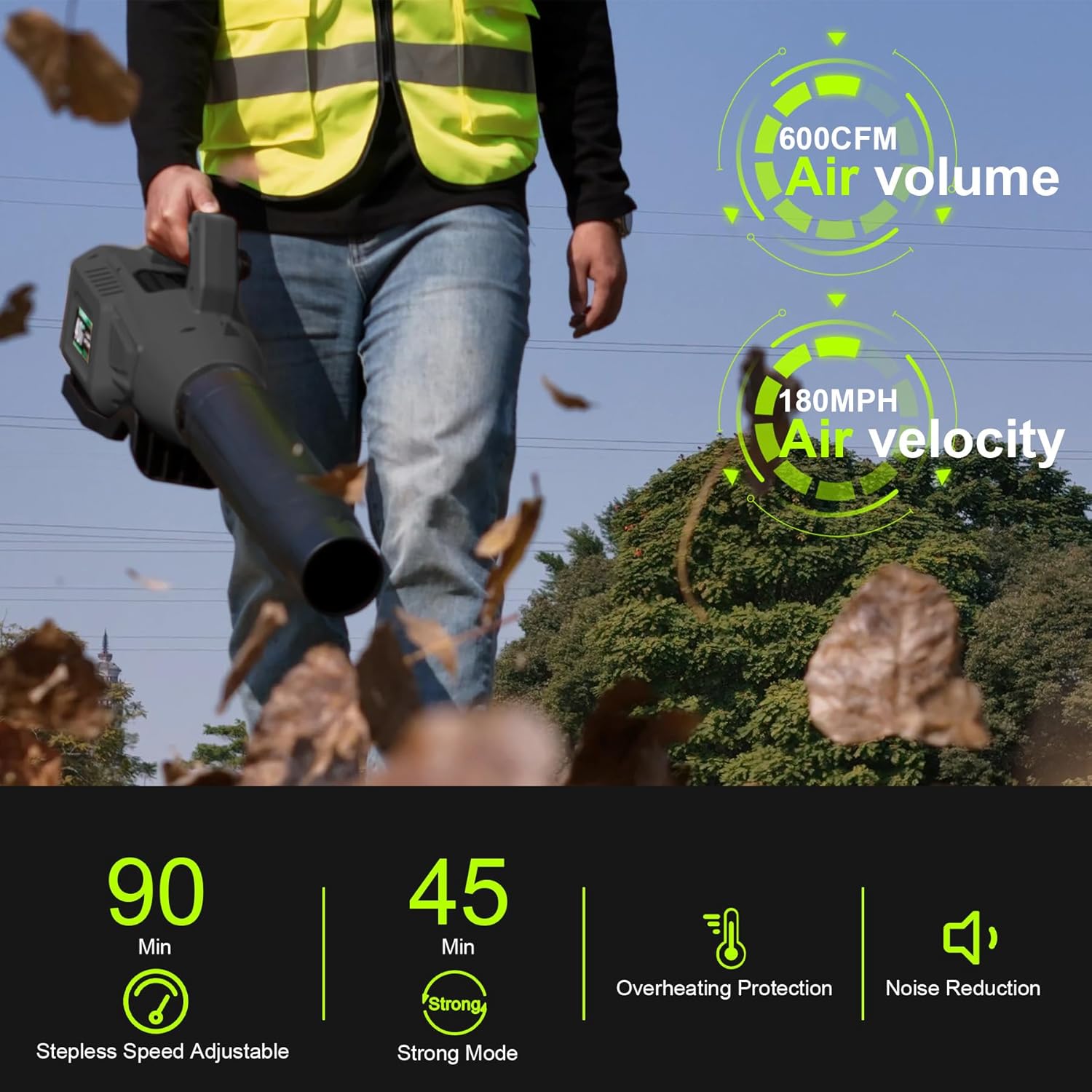 - Variable Speed Mode and Strong Mode: Tailor your cleaning experience with our battery powered leaf blowers featuring a variable speed mode, from 200 CFM to 500 CFM for everyday tasks and a Strong Mode that delivers 600CFM, ensuring efficient leaf removal