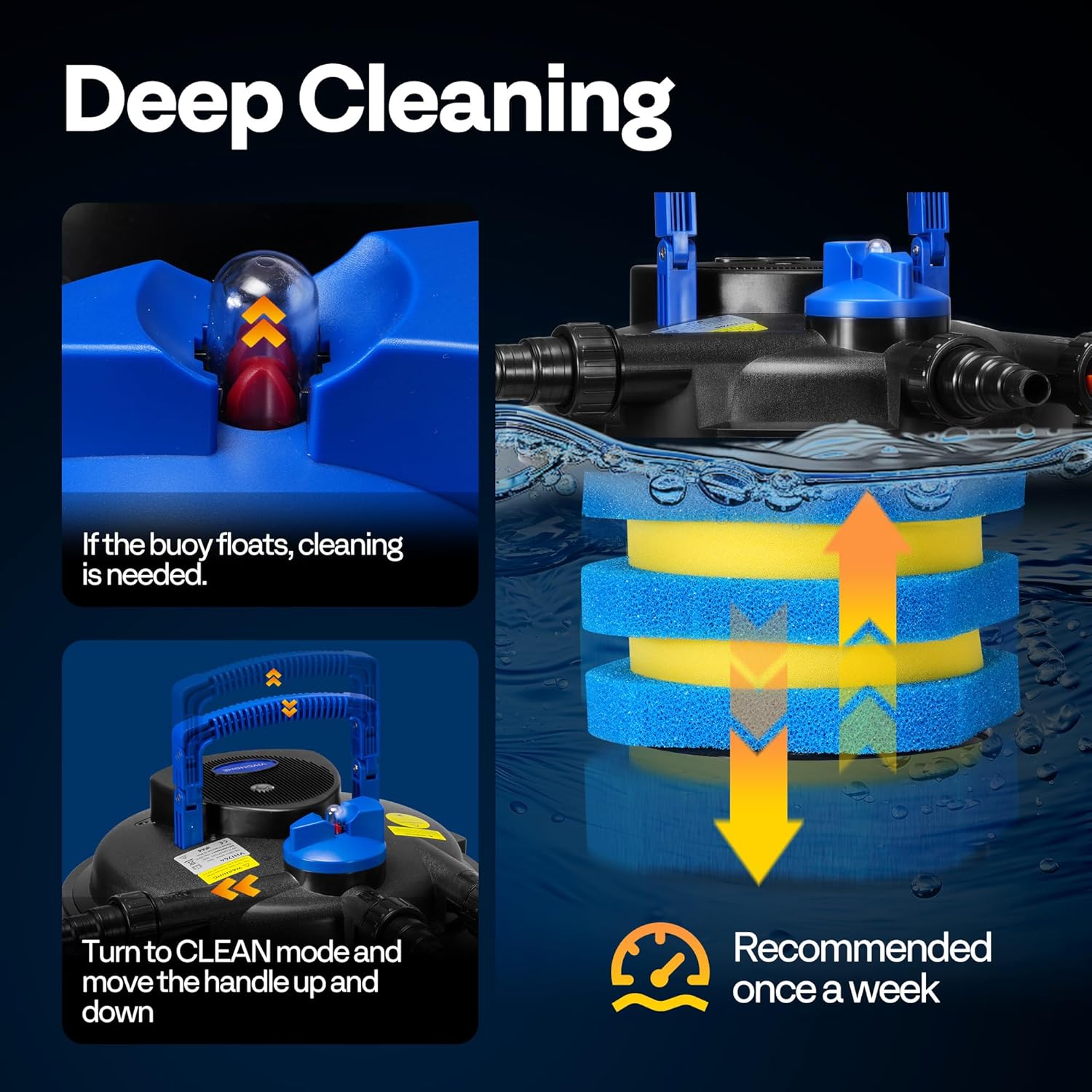 - EASY OPERATION & MAINTENANCE: The function switch allows you to easily switch between FILTER and CLEAN modes; Turn to sewage outlet and repeatedly move the handle up and down until clear water flows from the outlet, which ensures a more thorough cleaning of the filter sponges; When the buoy floats, itโs time to clean it; It is recommended to clean the filter sponges once a week to maintain optimal performance; A separate lamp replacement guide and an extra lamp are included for your convenience
