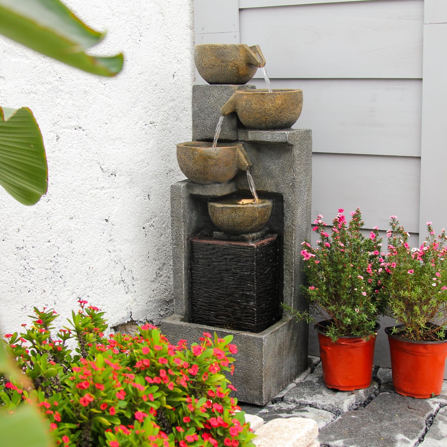 - Modern 5-Tier Design: YZM outdoor water fountain feature a modern design combined with natural elements. The 4-tier bowl design, along with 1-tier cascading tower design, and the gray and brown colors harmonize to create a modern work of art that is a great addition to any home dรฉcor