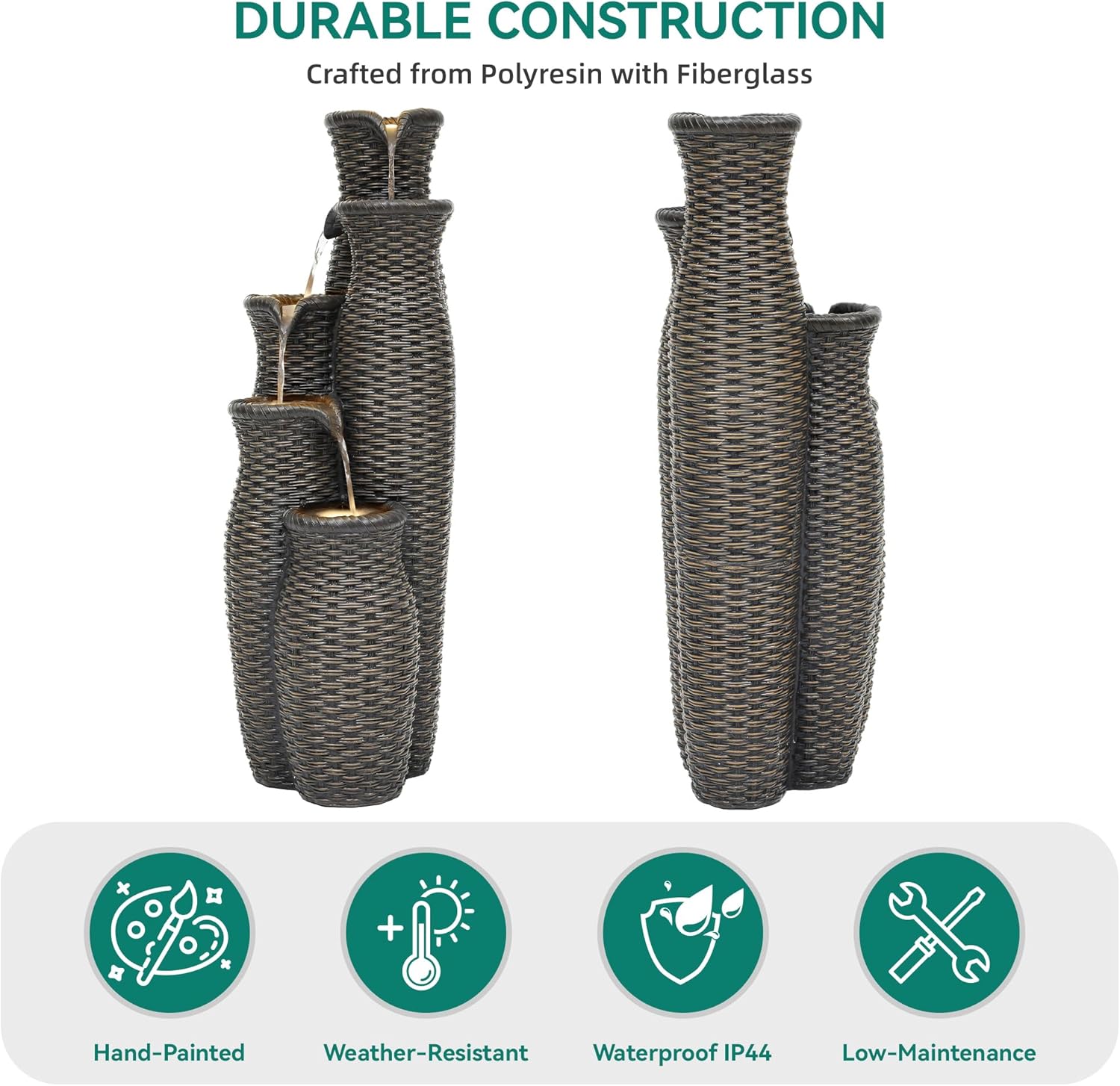 - UNIQUE WOVEN-INSPIRED DESIGN: Our elegant tall 5-tier vase outdoor fountain, sized at 14.76"L X 12.01"W X 32.87"H, boasting a one-of-a-kind 3D faux rattan texture. This outdoor resin fountain combines modern aesthetics with natural charm. It's not just a fountain; it's a statement piece that will instantly elevate the aesthetics of your garden, patio, or backyard.