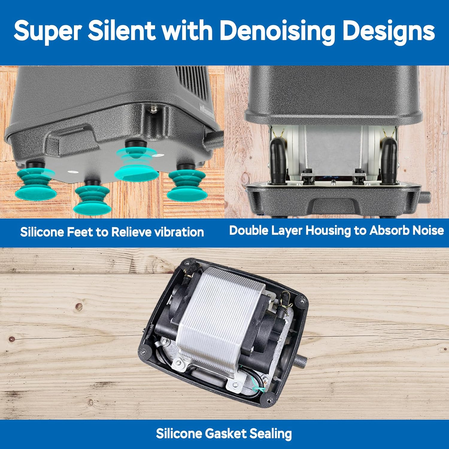 - QUIET - Our linear air pump experiences near-silent performance thanks to our multi-layer noise reduction system: double-layered housing, vibration-absorbing silicone feet, and precision silicone gasket sealing.
